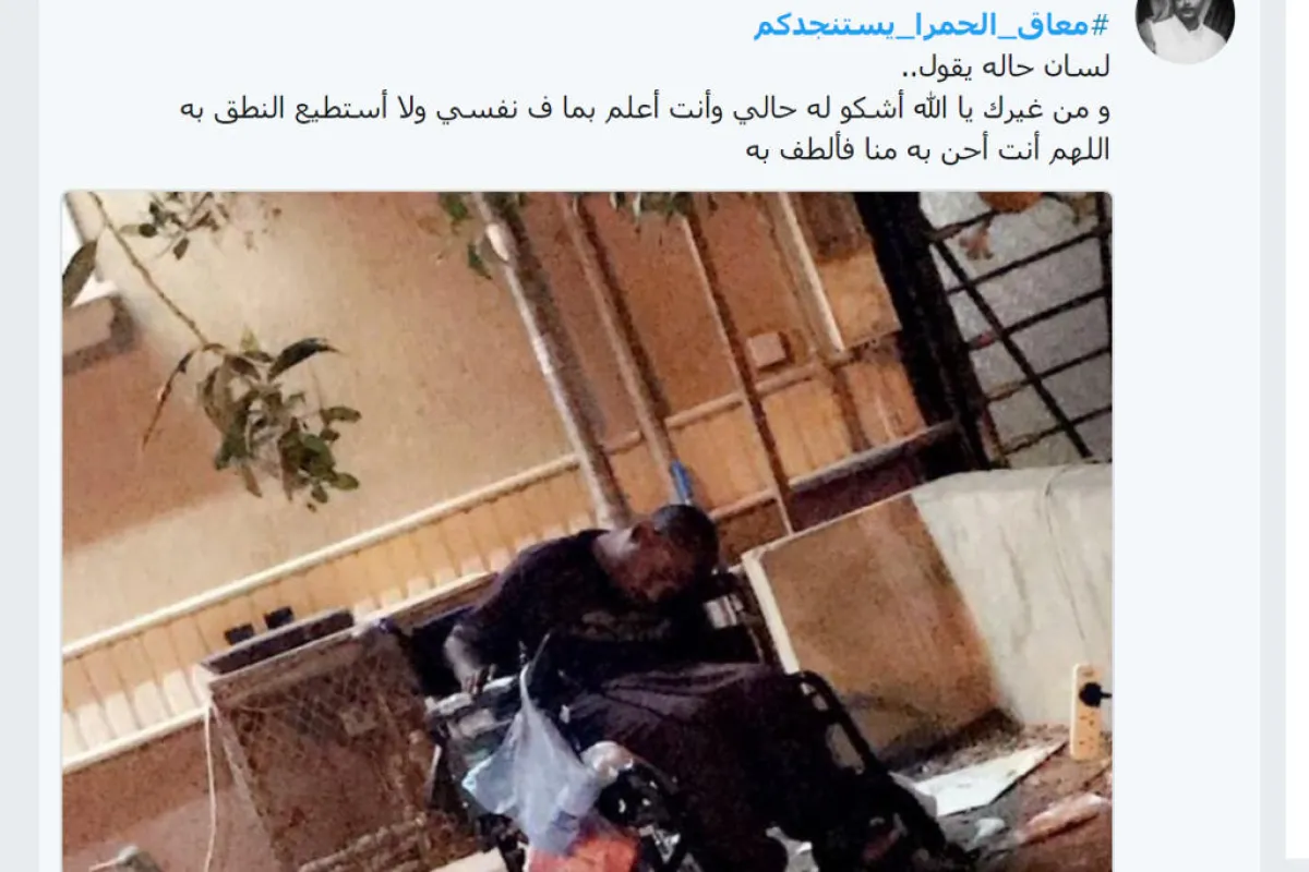 أثارت تغريدة وصورة مرفقة برسالة نصية حفيظة نشطاء في موقع "تويتر"، وارتبط بالتغريدة وسم حمل عنوان "#معاق_الحمرا_يستنجدكم"، وعلق النشطاء على الصورة: "معاق إلى جانب صندوق قمامة".