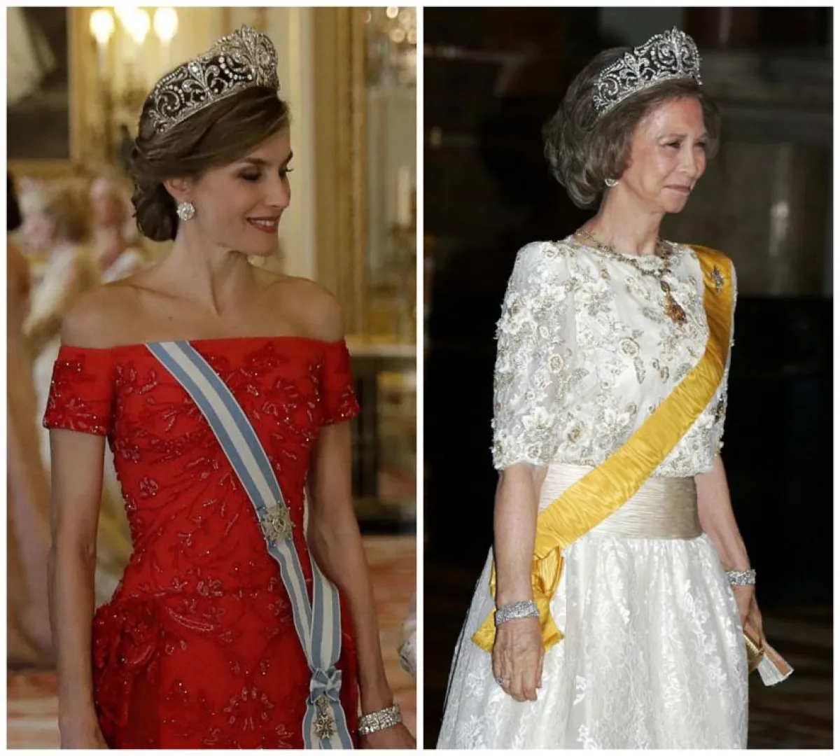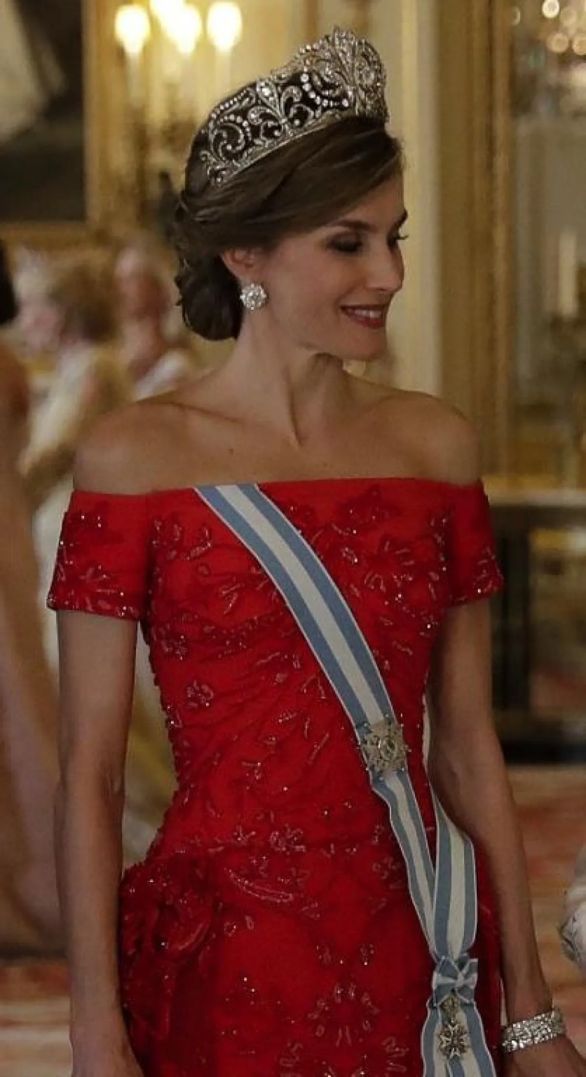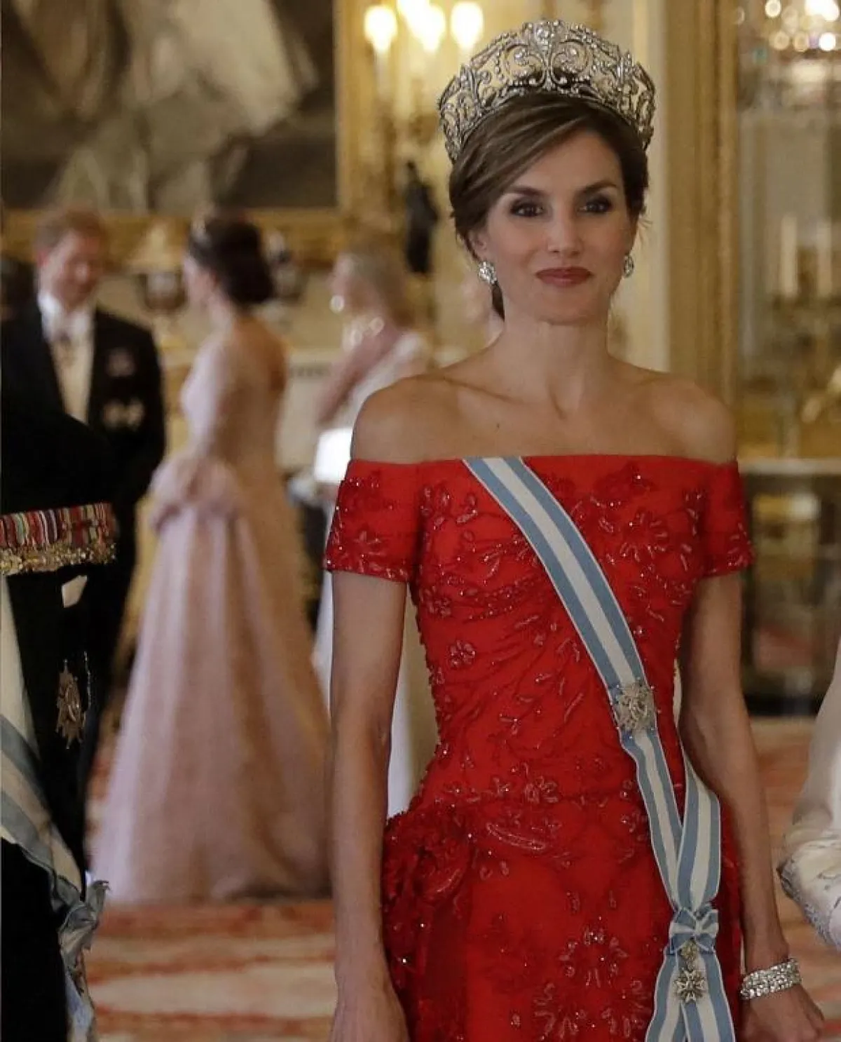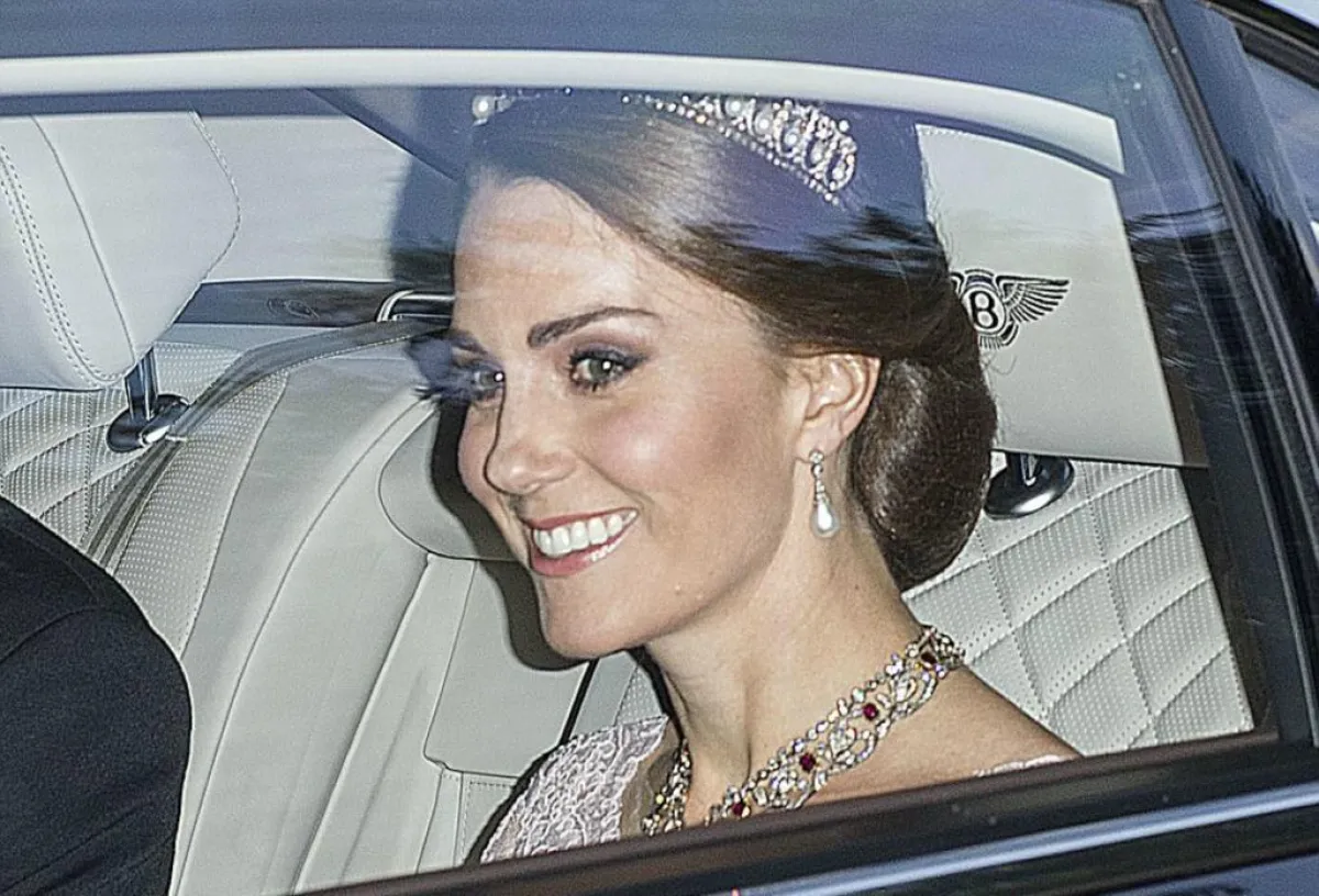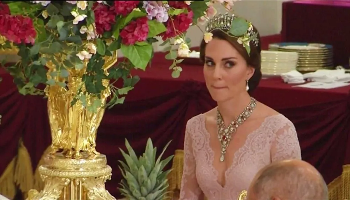 في حفل عشاء فاخر في قصر "باكنغهام" Buckingham palace أُقيم على شرف ملك اسبانيا "فيليب" Felipe والملكة "ليتيسيا" Letizia، شاهدنا دوقة كامبريدج "كايت ميدلتو Kate Middleton وقد تألقت في اطلالة أنثوية ناعمة اختارت فيها فستان من الدانتيل باللون الزهري اُعتبر الأكثر جرأة لها منذ انضمامها للعائلة الملكية حيث أنه مفتوح بشكل لافت عند منطقة الصدر، وقد اختارت مع الفستان تاج مرصع بالألماس واللؤلؤ كان لليدي ديانا Lady Diana من قبلها، واللافت للنظر أيضاً في حفل عشاء القصر الملكي أن "الملكة ليتيسيا" Letizia قد اختارت أيضاً تاج والدة زوجها الملكة صوفيا ونسقته مع فستان أحمر مطرز.
