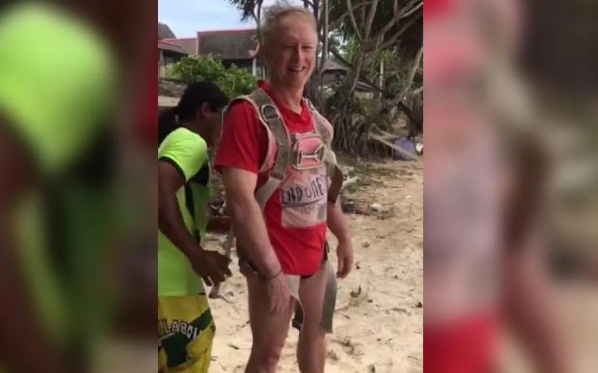 وبحسب اللقطات، ظهر السيد روجر جون هوسي وهو يبتسم لزوجته وهي تقوم بتصويره على شاطئ كاتا في فوكيت، ولكن بعد لحظات قليلة من رفعه في الهواء، سقط روجر البالغ من العمر 70 عاماً في المياه من على ارتفاع أكثر من 30 متراً بينما كانت زوجته وعشرات الناس على الشاطئ يشاهدون هذه اللحظة المرعبة.