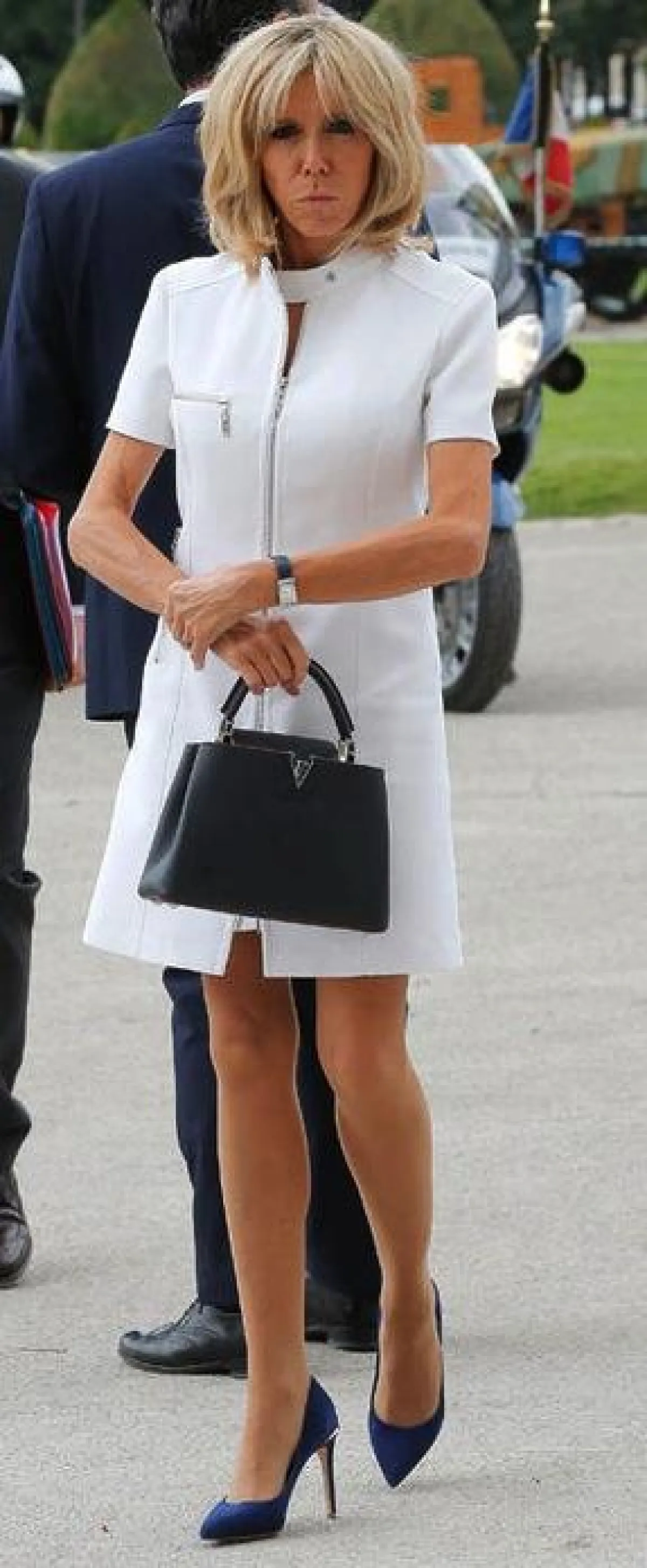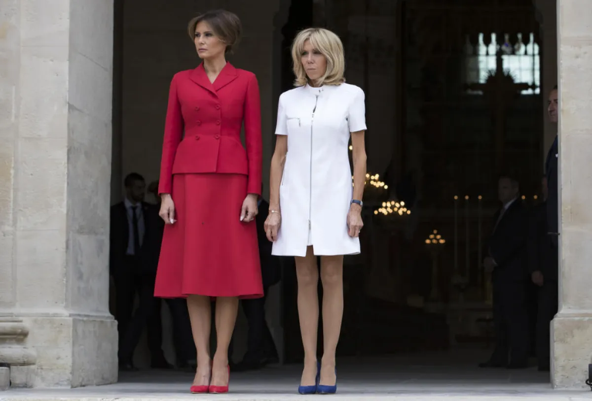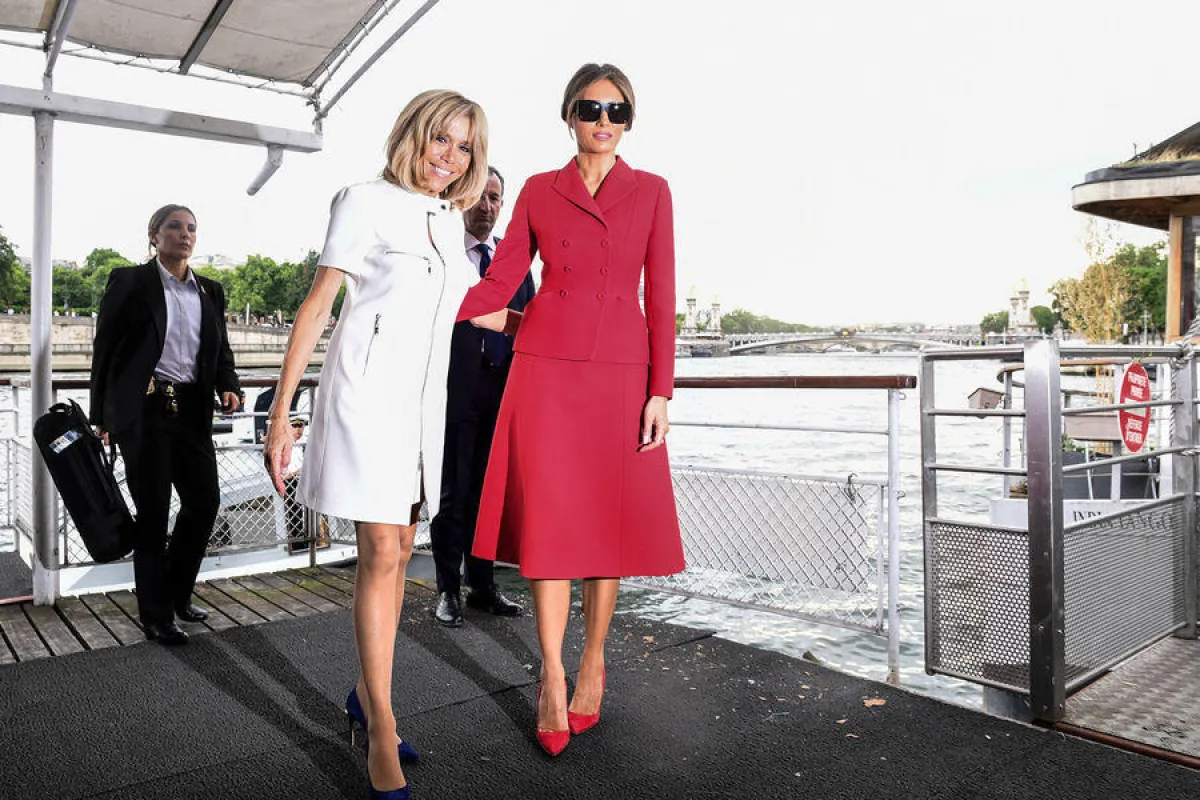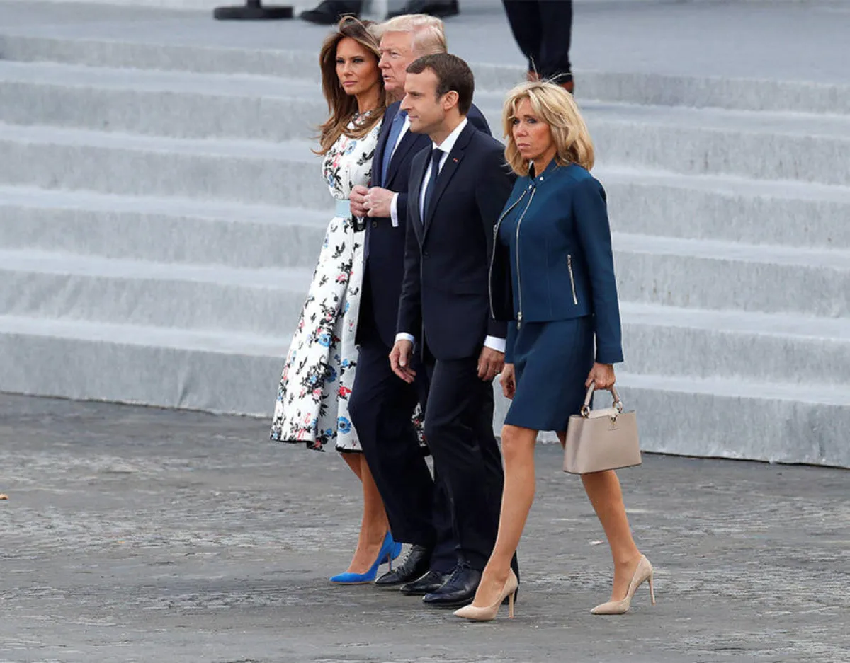 وقد احتمدت المنافسة على الأناقة بين سيدة فرنسا الأولى وسيدة أمريكا الأولى، ليس فقط في العيد الوطني الفرنسي بل أيضاً في الأيام التي سبقت الاحتفال، حيث شاهدنا "بريجيت ماكرون" Brigitte Macron بإطلالات ناعمة افتقرت بشكل أو بآخر لعنصر الابهار، حيث اختارت في اليوم الأول فستان قصير باللون الأبيض، ولعشاء مسائي اختارت فستان مطبع بالورود من "لويس فويتون" Louis Vuitton، أما لاحتفال اليوم فقد اختارت تيور باللون الكحلي.
