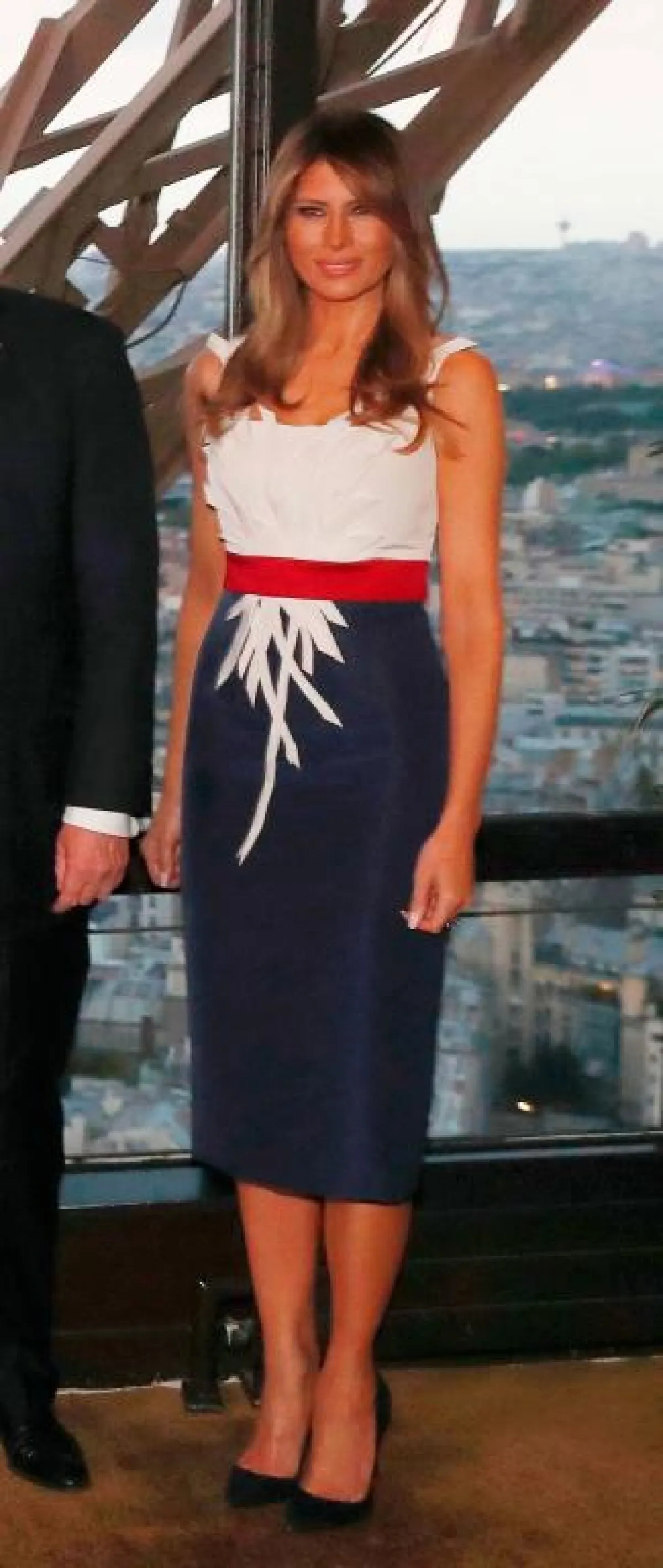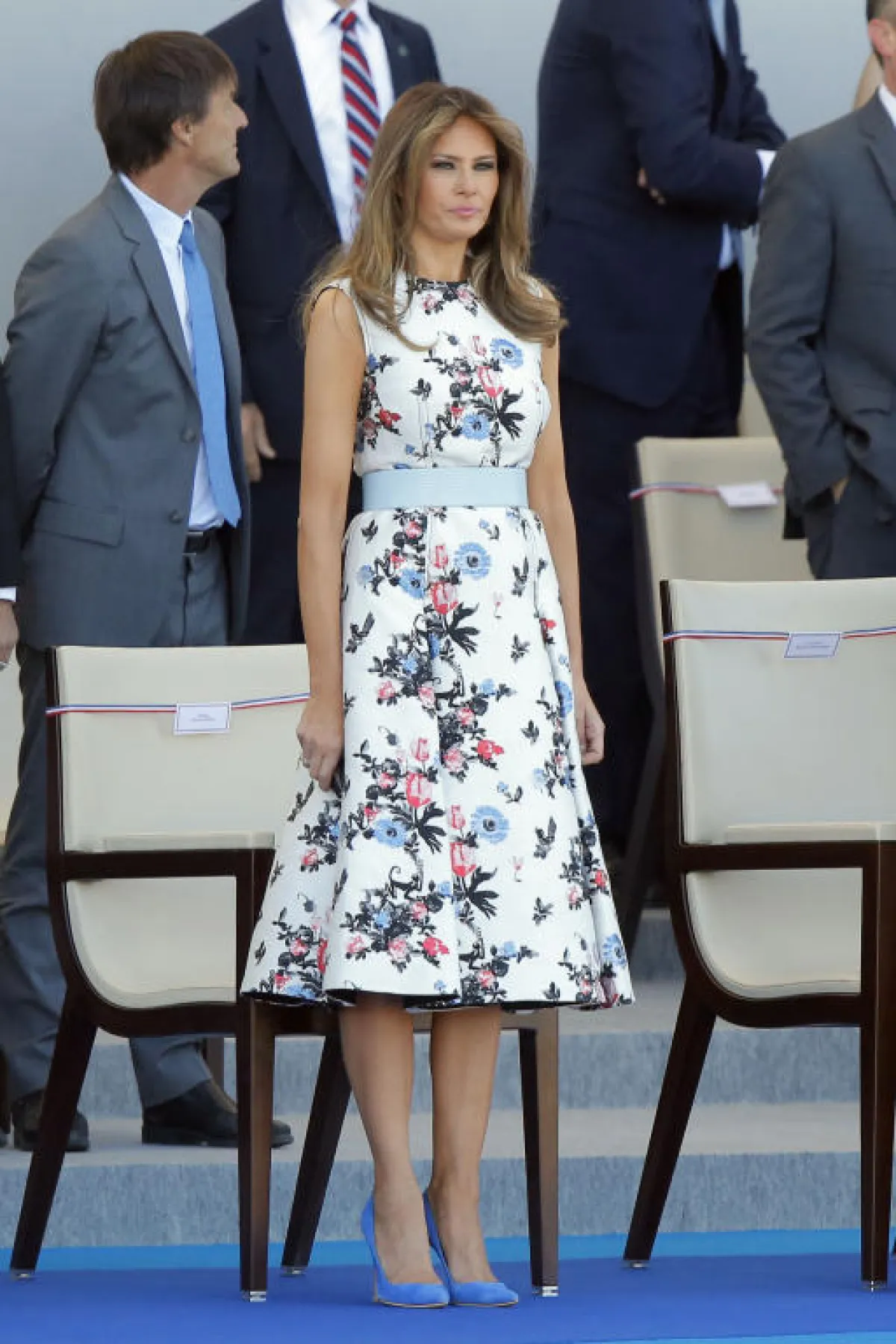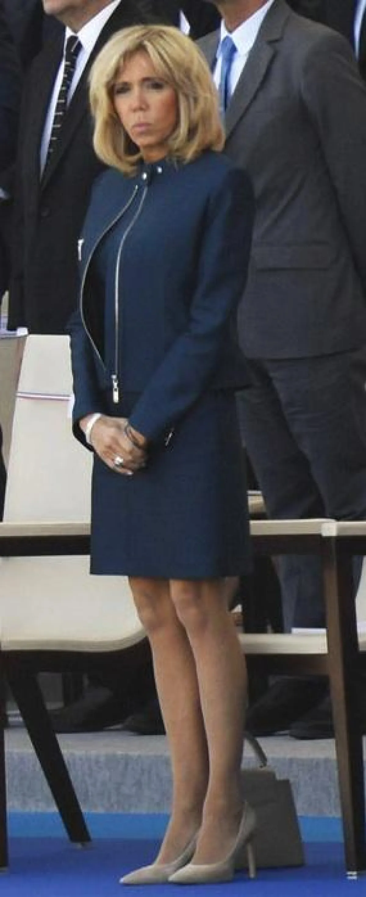 وقد احتمدت المنافسة على الأناقة بين سيدة فرنسا الأولى وسيدة أمريكا الأولى، ليس فقط في العيد الوطني الفرنسي بل أيضاً في الأيام التي سبقت الاحتفال، حيث شاهدنا "بريجيت ماكرون" Brigitte Macron بإطلالات ناعمة افتقرت بشكل أو بآخر لعنصر الابهار، حيث اختارت في اليوم الأول فستان قصير باللون الأبيض، ولعشاء مسائي اختارت فستان مطبع بالورود من "لويس فويتون" Louis Vuitton، أما لاحتفال اليوم فقد اختارت تيور باللون الكحلي.
