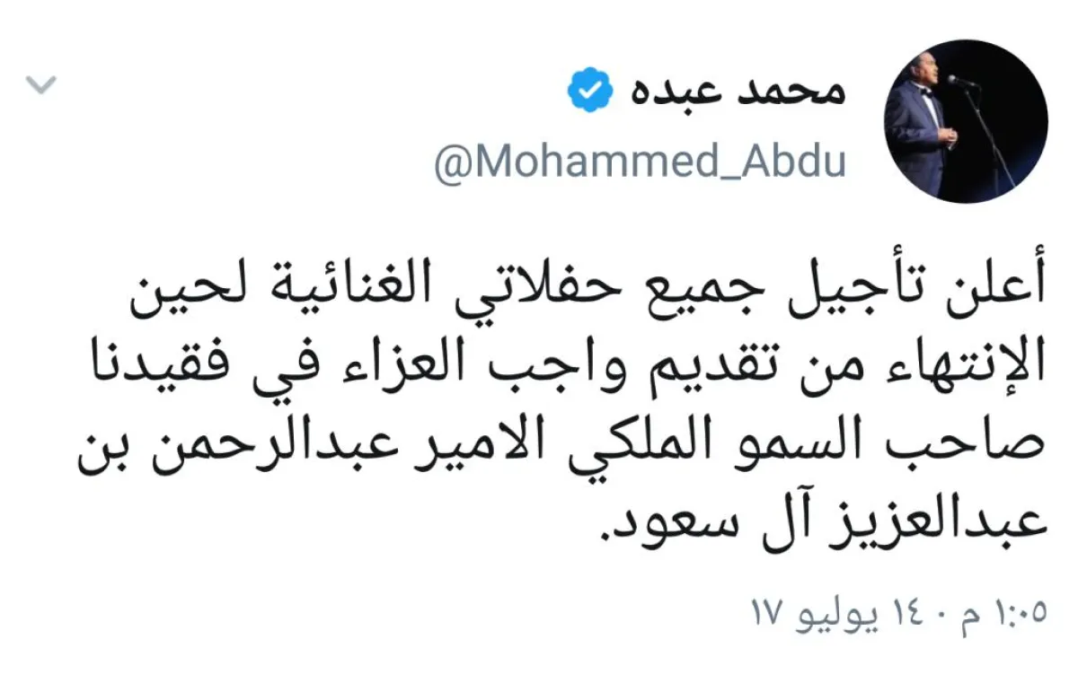 وكان فنان العرب يستعد لإقامة حفلة عكاظ يوم 14 يوليو إلا أنه غرد عبر حسابه أمس الجمعة قائلا:" أعلن تأجيل جميع حفلاتي الغنائية لحين الإنتهاء من تقديم واجب العزاء في فقيدنا صاحب السمو الملكي الأمير عبدالرحمن بن عبدالعزيز آل سعود".
