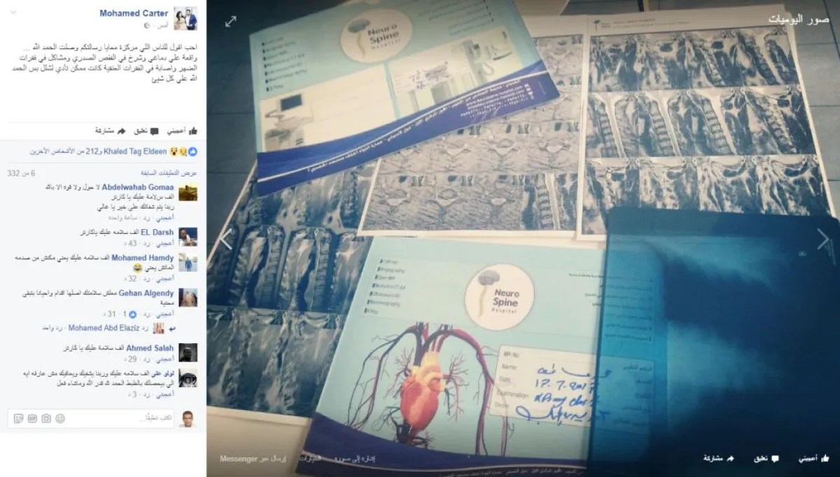 كارتر كشف عن تفاصيل الحادث بنفسه مؤكداً أنه سقط من اعلى السلم، وتعرض لاصابات في مناطق متعددة، وقال: "أحب أقول للناس اللي مركزة معايا رسالتكم وصلت الحمد لله.. وقعت على دماغي وشرخ في القفص الصدري ومشاكل في فقرات الضهر وإصابة في الفقرات العنقية كانت ممكن تؤدي لشلل بس الحمد الله علي كل شيء".