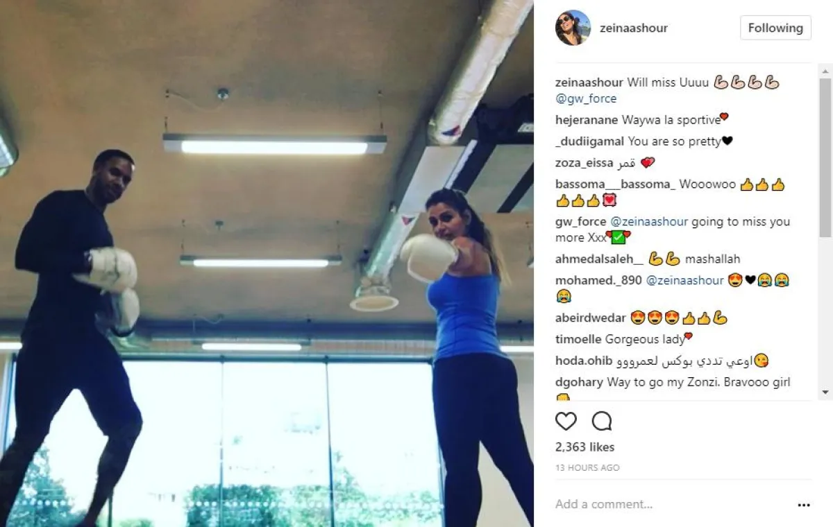 بعد الأنباء المتكررة عن انفصالها عن زوجها المطرب عمرو دياب، يبدو أنّ زينة عاشور قررت أن تعتمد على عضلاتها للدفاع عن نفسها، ونشرت أول صورة لها أثناء ممارستها التدريب على فنون القتال، كما وجهت رسالة افتقاد لمدربها جاري ورد، الذي طالبها سابقًا بأن تكون "أكثر قوة".