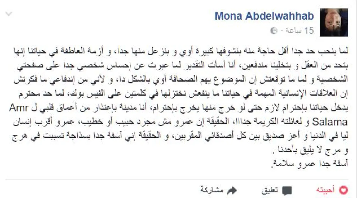اضافت: أنا مدينة باعتذار من أعماق قلبي لـ عمرو سلامة ولعائلته الكريمة جدًّااا، الحقيقة إن عمرو مش مجرد حبيب أو خطيب، عمرو أقرب إنسان ليّا في الدنيا، وأعز صديق بين كل أصدقائي المقربين، والحقيقة إني آسفة جدًّا بسذاجة تسببت في هرج و مرج لا يليق بأحدنا .. آسفة جدًّا عمرو سلامة.