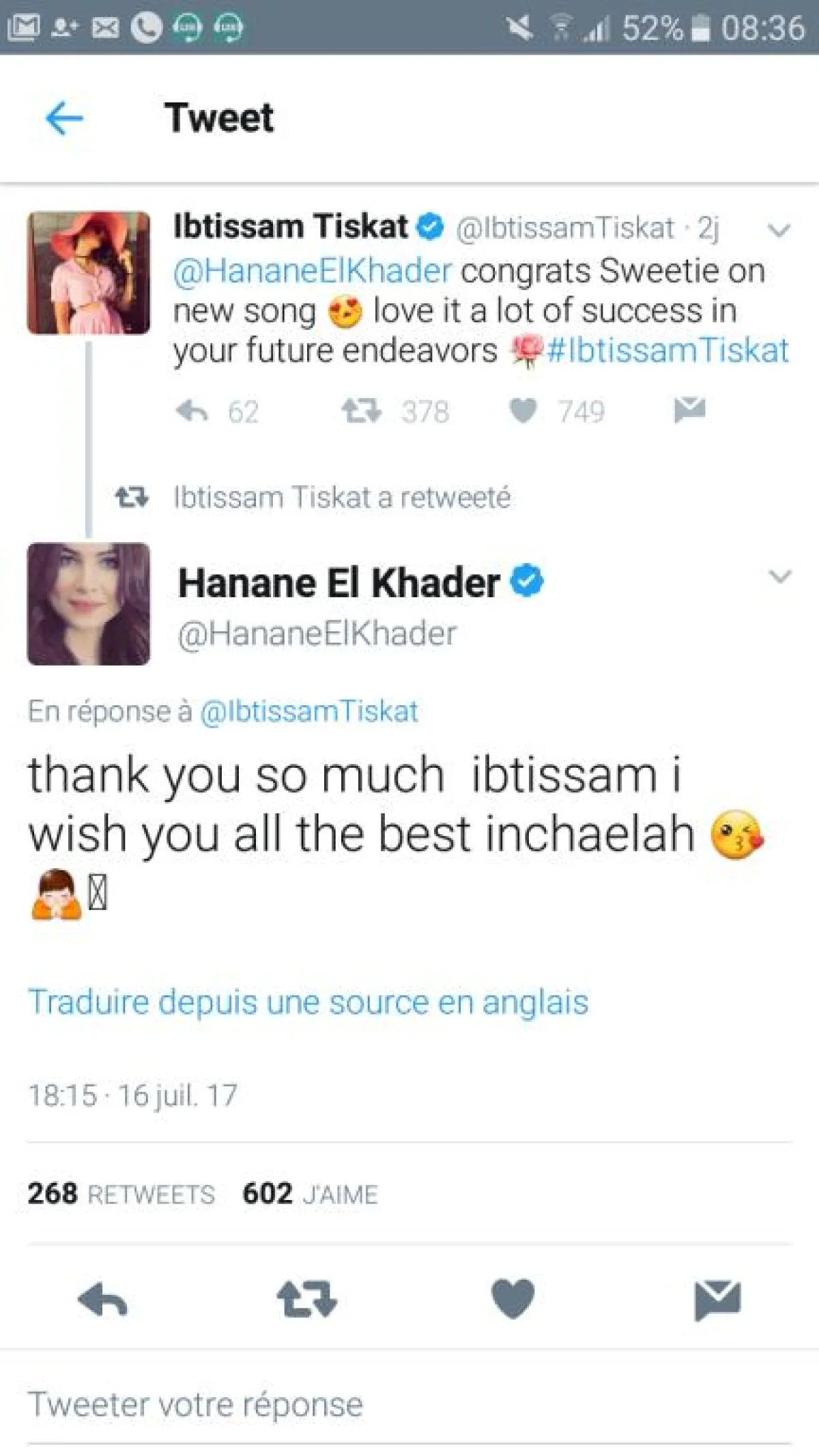وردّت حنان الخضر على تغريدة ابتسام وشكرتها قائلة: "شكرا جزيلا لك ابتسام..أتمنى لك التوفيق ".