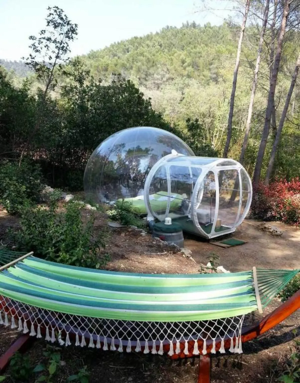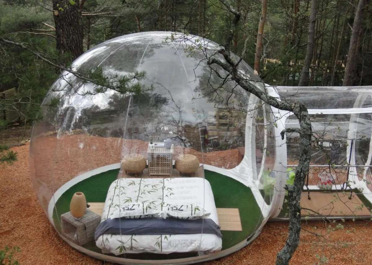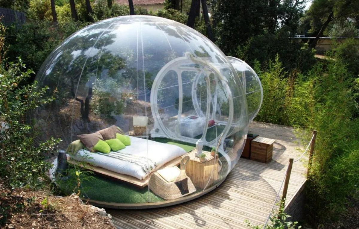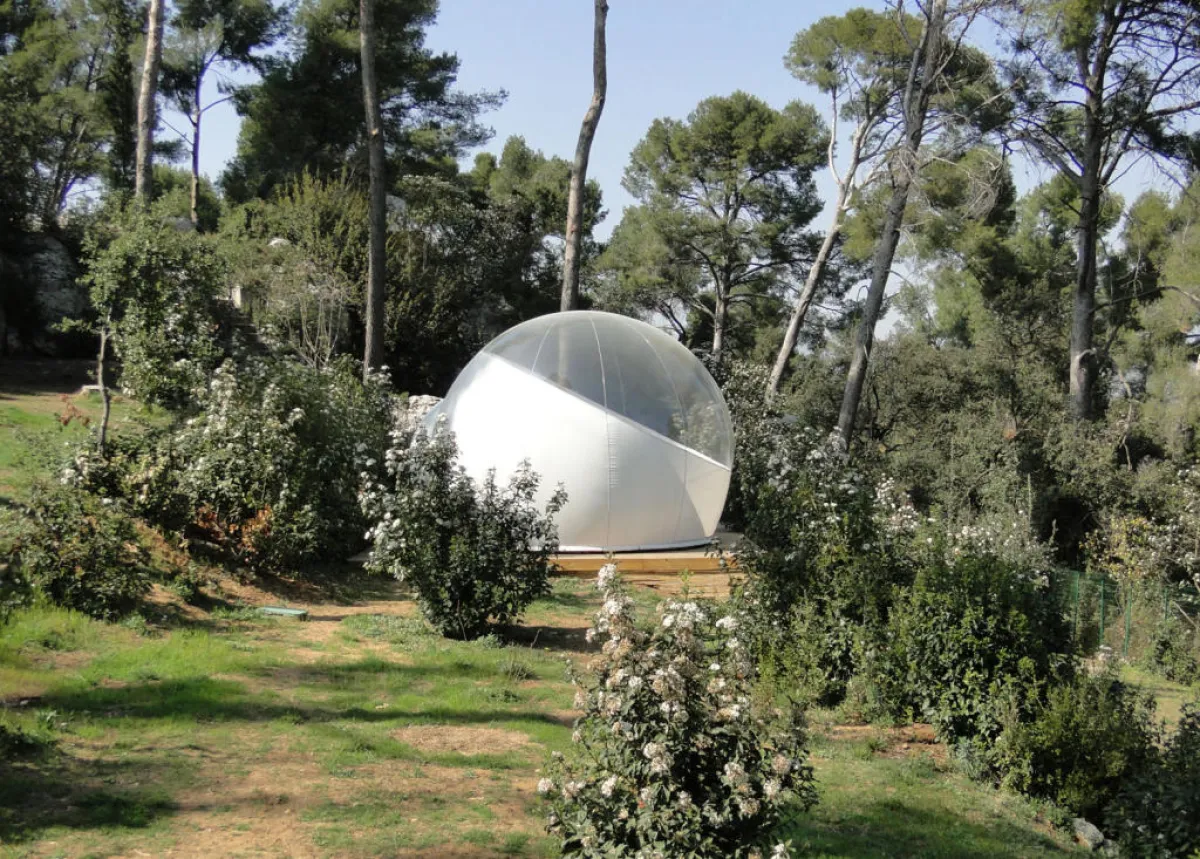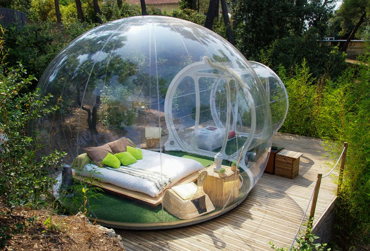 داخل فقّاعة شفّافة وكبيرة من الـ"بلاستيك"، يمكن الإقامة وسط غابة فرنسيّة، في فندق "أتراب ريف هوتيل". على بعد نحو 12 كيلومترًا شمالي "مرسيليا"، نفّذ مهندسون فرنسيّون سنة 2010 هذا المشروع العائلي، الذي يقوم على مجموعة من الفقاعات، التي تسمح لنزلائها فرصة قضاء الليل في العراء تحت النجوم.