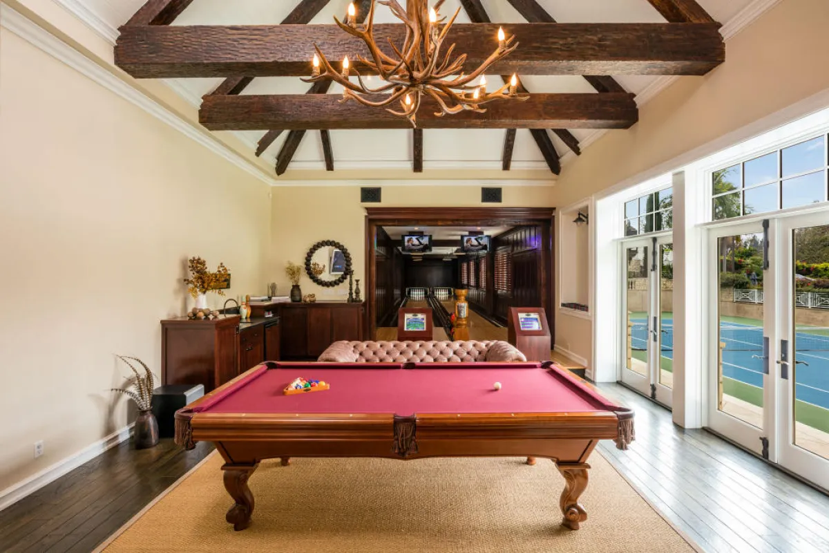 في المطبخ، يضيء الأبيض المساحة، حيث خزائن الخشب وأسطح الرخام. أمّا في مساحة الترفيه، فقد خصّصت النجمة قاعة لمشاهدة الأفلام، أثّثتها بأرائك جلد وثيرة. وتضفي أعمال الخشب لمسات فخمة دافئة في المساحة الرحبة. وتتوافر أيضًا مساحة مخصّصة للعب الـ"بولينغ"، يجاورها ركن يحوي طاولة الـ"بلياردو"، تتدلّى فوقها ثريا مبتكرة في تصميمها، الذي يحيل إلى أغصان أشجار الغابات المضاءة.