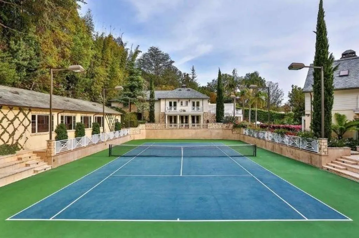 من بين نقاط الجذب في تصميم الفيللا أيضًا: الجلسات الخارجية الفخمة، كتلك المسقوفة والمُطلّة على ملعب "التنس"، والمؤثّثة بطاولة خشب مستطيلة مُخصّصة لاستضافة المآدب، وتحوطها أرائك معدّة من الخيزران، ومكسوّة بأقمشة مُقلّمة بالأزرق والأبيض.