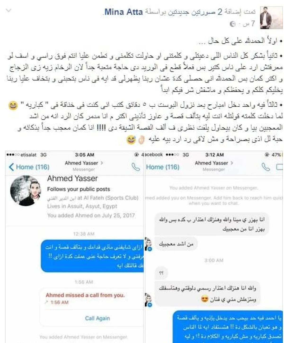 تابع قائلا: ثالثاً فيه واحد دخل امبارح بعد نزول البوست ب ٥ دقائق كتب اني كنت في خناقة فى " كباريه " لما دخلت كلمته قولتله انت ليه بتألف قصة وعاوز تأذينى اكتر م انا مدمر كان الرد انه من اشد المعجبين بيا و كان بيحاول يلفت نظري ف ألف القصة الشيقة دي !!!! انا كمان معجب جداً بذكائه و حبة للاذى بصراحة و مش لاقى رد ارد بيه عليه!!