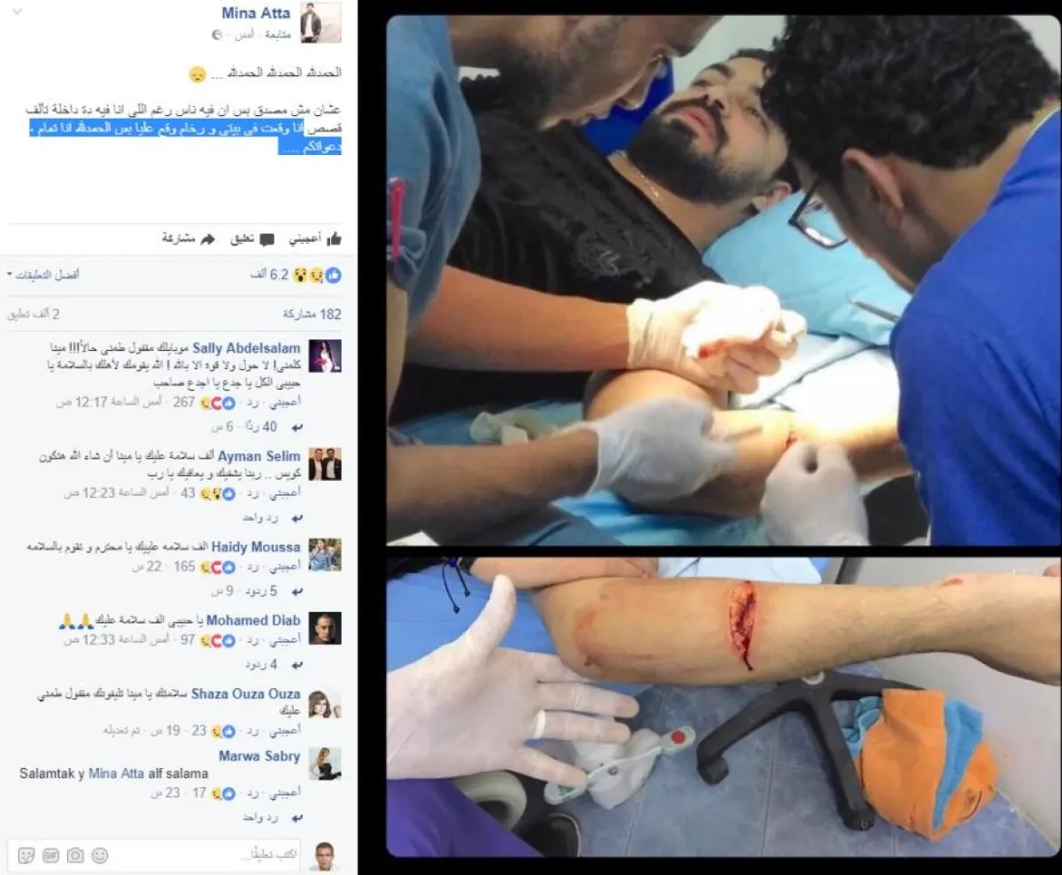 مينا تعرّض لصدمة من داخل المستشفى بعد إبلاغه بانتشار أنباء تؤكد إصابته بجرح في وريد اليد اليمنى بعد معركة بالأسلحة البيضاء داخل ملهى ليلي، فعلق سريعا قائلاً: الحمد لله الحمد لله الحمد لله ...عشان مش مصدق بس ان فيه ناس رغم اللي انا فيه ده داخلة تألف قصص انا وقعت فى بيتي و رخام وقع عليا بس الحمد لله انا تمام ، دعواتكم.