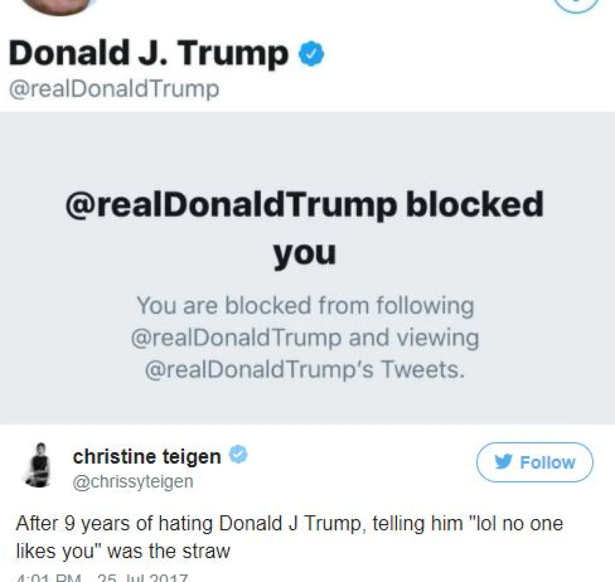 يبدو أنّ عارضة الأزياء الشهيرة كريسي تيغن Chrissy Teigen قد تمكنت فعلًا من استفزاز الرئيس الأمريكي دونالد ترامب Donald Trump، الذي حظرها عن حسابه الرسمي في تويتر.