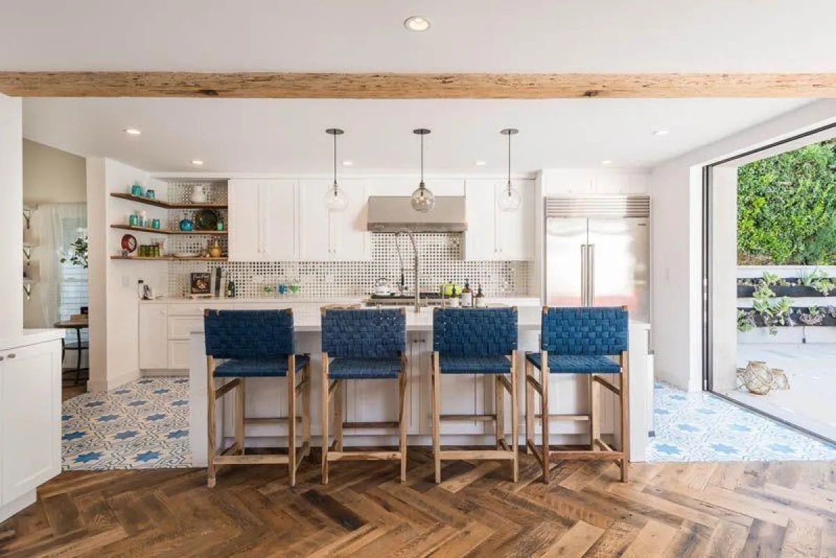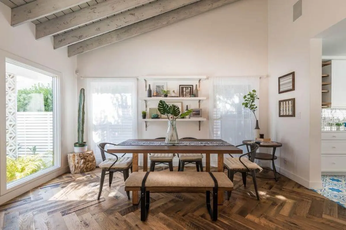 تبدو عناصر غرفة الطعام، من ناحيتها، مُختارة بإتقان، وهي تشي بالفخامة، وتبعد عن التقليديّة. إذ تحوط الكراسي الطاولة من جهاتها الثلاث، فيما يقابل "بانكيت" الجهة الرابعة. ومن المُلاحظ غياب طاولة الـ"بوفيه"، وبالمُقابل حضور زوجين من الرفوف على الجدار الرئيس الأبيض، يحملان إطارات الصور وأوعية النباتات صغيرة الحجم. وفي المطبخ، من الواضح أنّ الديكور مشغول بإتقان بالغ. وبطلاء أبيض، تتلألأ الخزائن الخشب، وتتناغم والأدوات الكهربائيّة بلون الـ"ستاينلس ستيل". وتفصل "جزيرة" بين المطبخ ومساحة الاستقبال.
