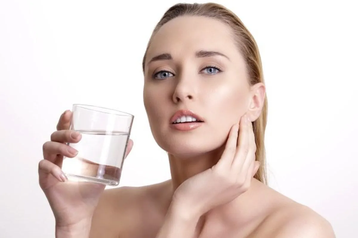 فالماء يساهم في تزويد الجسم بالمعادن الضرورية، ويساعد في الحصول على بشرة رطبة ونضرة. لذا، يُنصح بتناول 6 - 8 اكواب من الماء يوميًّا، على أن يتم تقسيمها 2 صباحًا قبل الطعام، وكوبين قبل الغداء، وكوبين آخرين قبل العشاء، وكوبين قبل النوم (يحميان وفق الدراسات الأخيرة من الجلطات القلبية)".