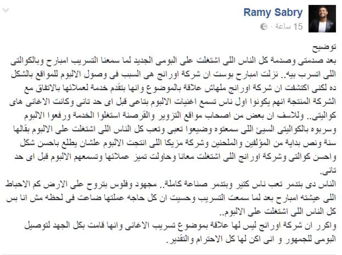 رامي حذف المنشور الخاص بالهجوم على شركة الاتصالات، كما حذف تلويحه باعتزال الغناء، ونشر بدلًا منهما توضيحًا جديدًا قال فيه: بعد صدمتي وصدمة كل الناس اللي اشتغلت على البومي الجديد، لما سمعنا التسريب امبارح وبالكواليتي اللي اتسرب بيه.. نزّلت امبارح بوست انّ شركة اورانج هي السبب في وصول الالبوم للمواقع بالشكل ده، لكن اكتشفت انّ شركة اورانج ملهاش علاقة بالموضوع، وانها بتقدم خدمة لعملائها بالاتفاق مع الشركة المنتجة، انهم يكونوا اول ناس تسمع اغنيات الالبوم بتاعي، قبل أي حد تاني وكانت الأغاني هاي كواليتي..