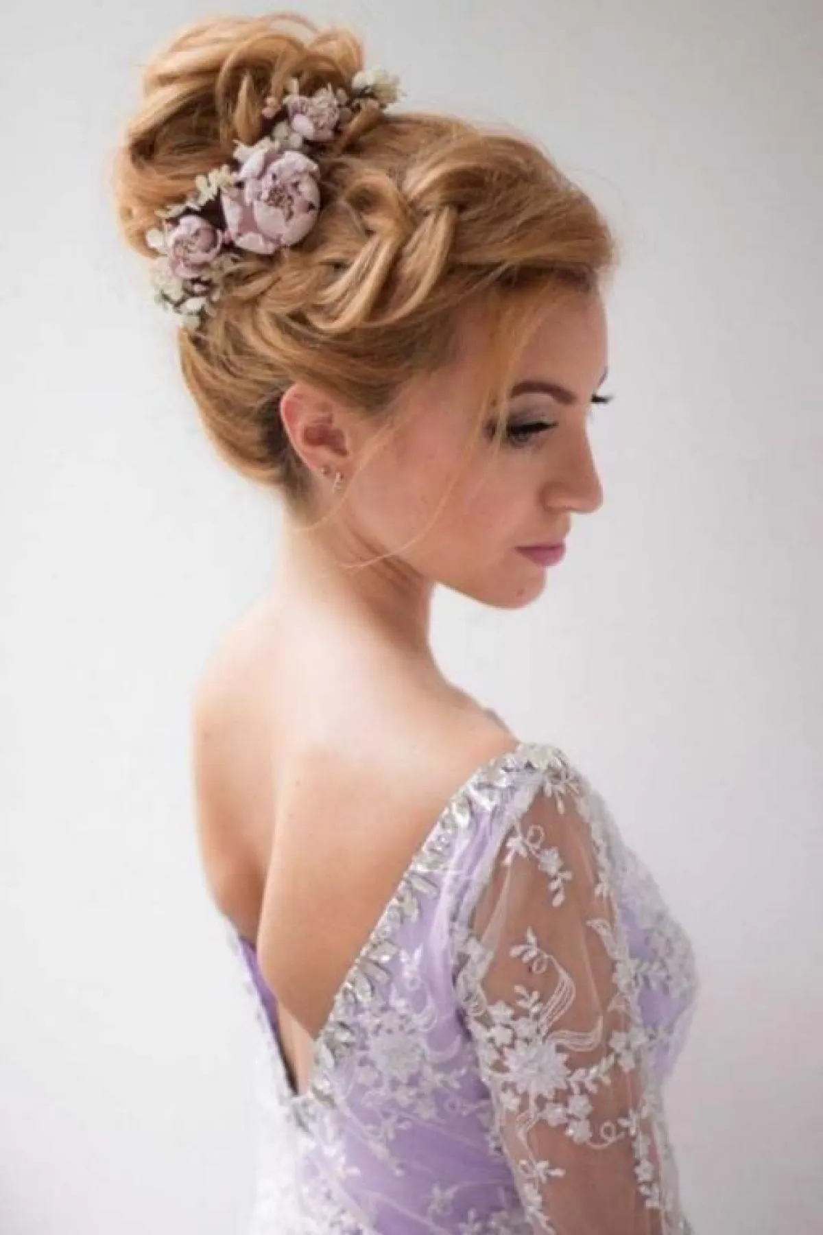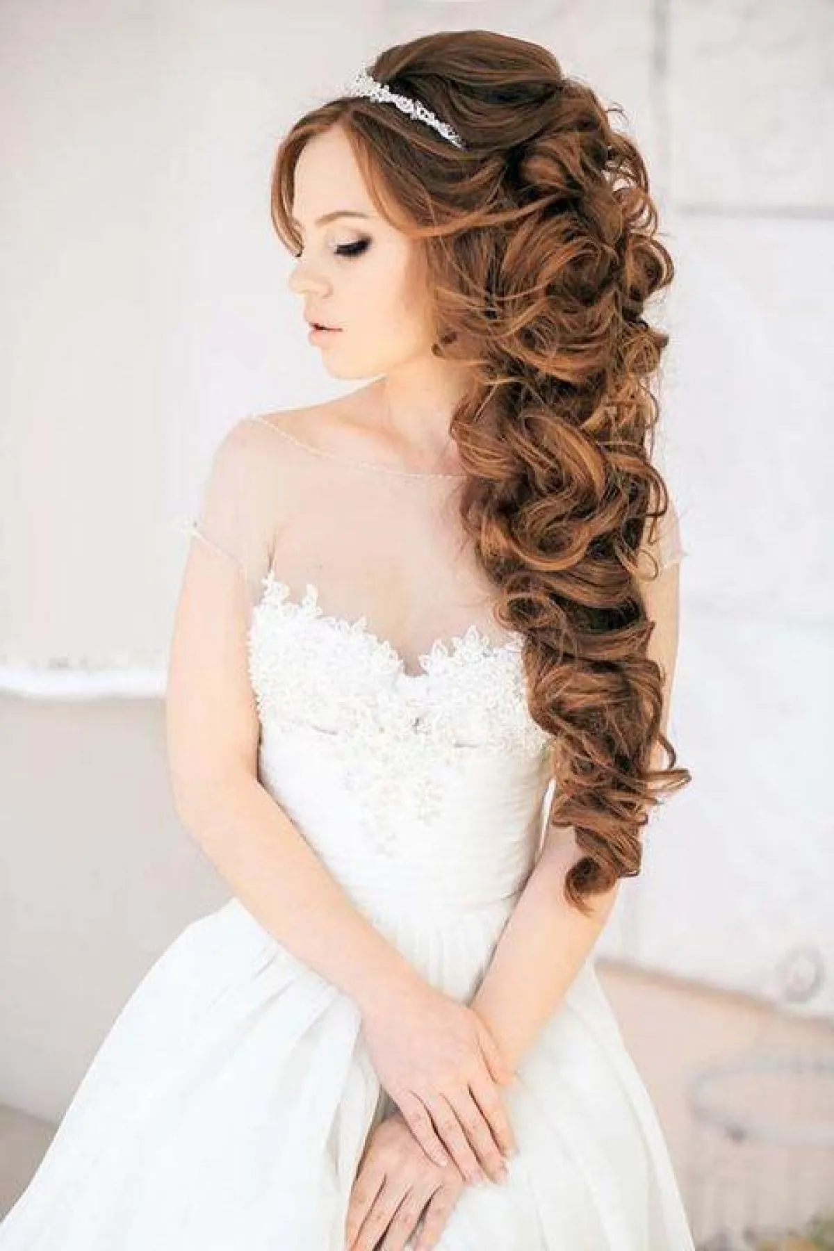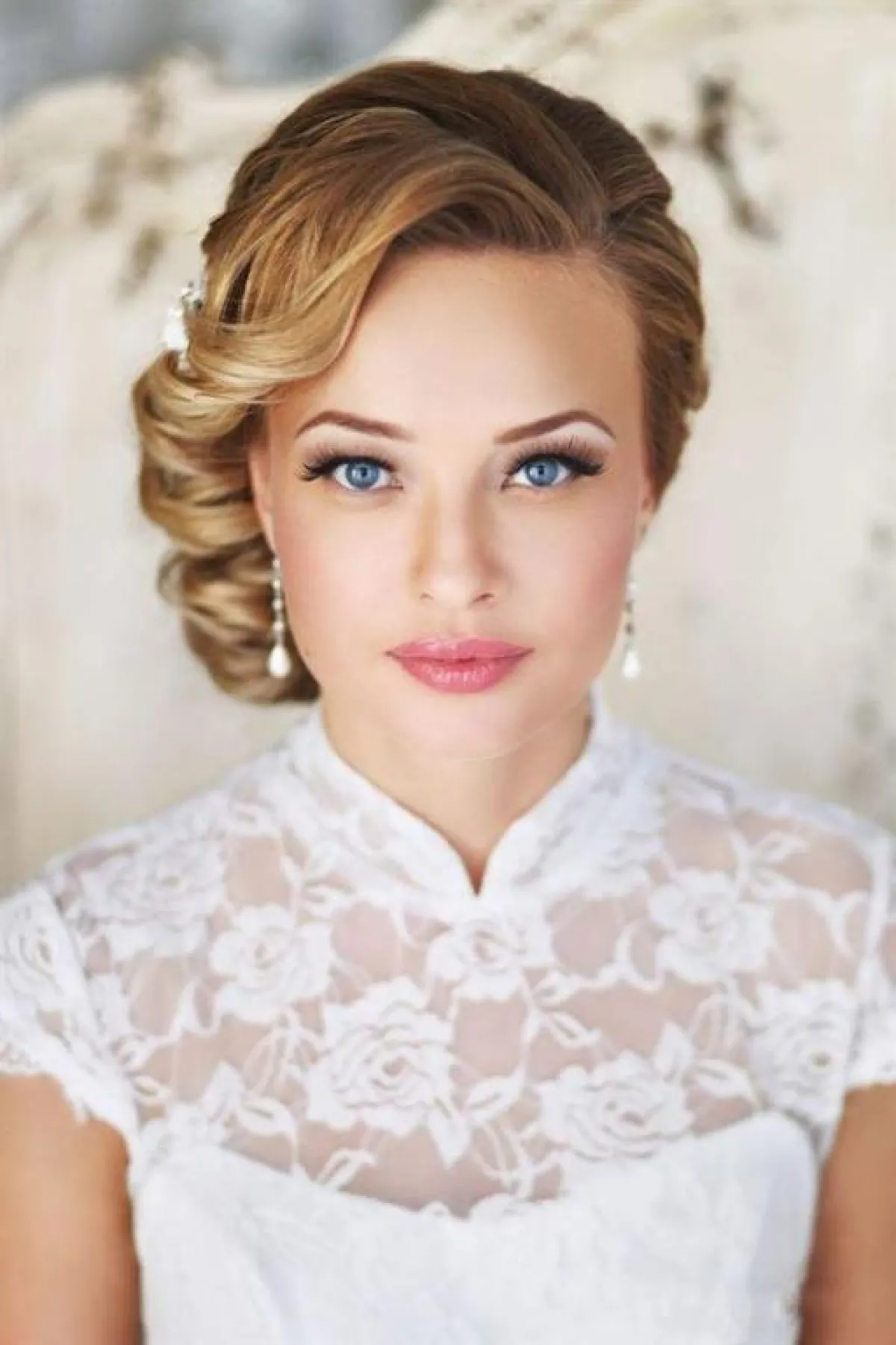 تسريحة جانبية لعروس اختارت فستان زفاف مكشوف عند الصدر
