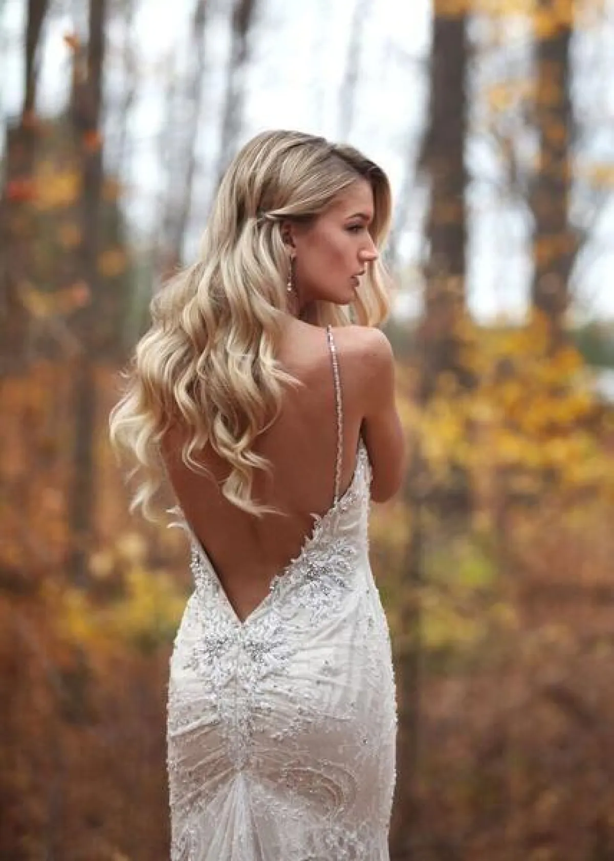 تجسد نمط الزفاف الكلاسيكي، انيقة و رومانسية، يوصى بتسريح الشعر بشكل متموج لتحقيق التوازن بين الكتفين المكشوفين، وإضافة لمسة إضافية من الجاذبية لمظهرك.