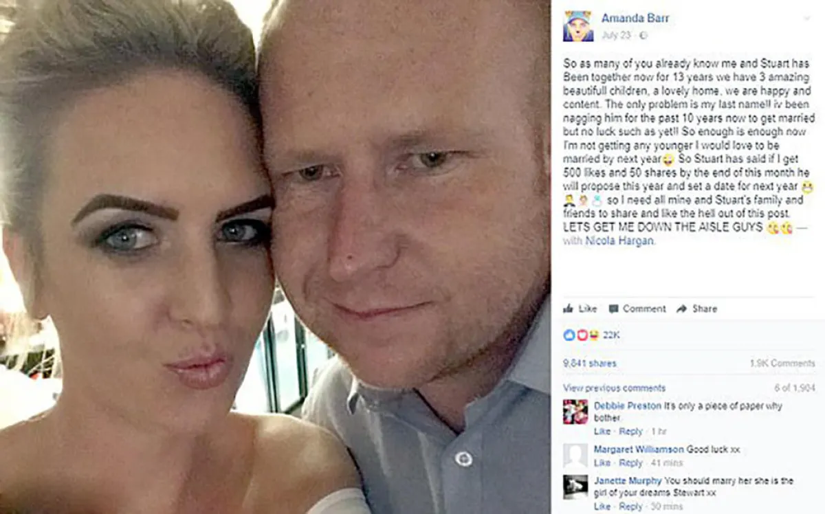 وفي التفاصيل التي ذكرتها صحيفة "ديلي ميل" البريطانية، فإن العروس أماندا فشلت في إقناع حبيبها ستيوارت بالزواج منها على مدى الأعوام العشرة الماضية، وفي النهاية وعدها بالزواج إذا ما تمكنت من الحصول على 500 إعجاب لمنشور على "فيسبوك".
