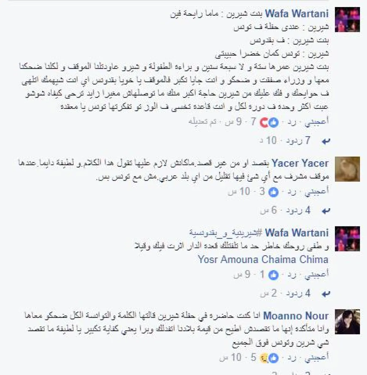 وأيّدها شاهد عيانٍ تونسي يدعى كريم بن عمار قائلاً: أنا كنت حاضر و شرين قالتها بكل تلقائية ، و ضحكنا على بنتها كيفاش قالتلها موش على بلادنا.