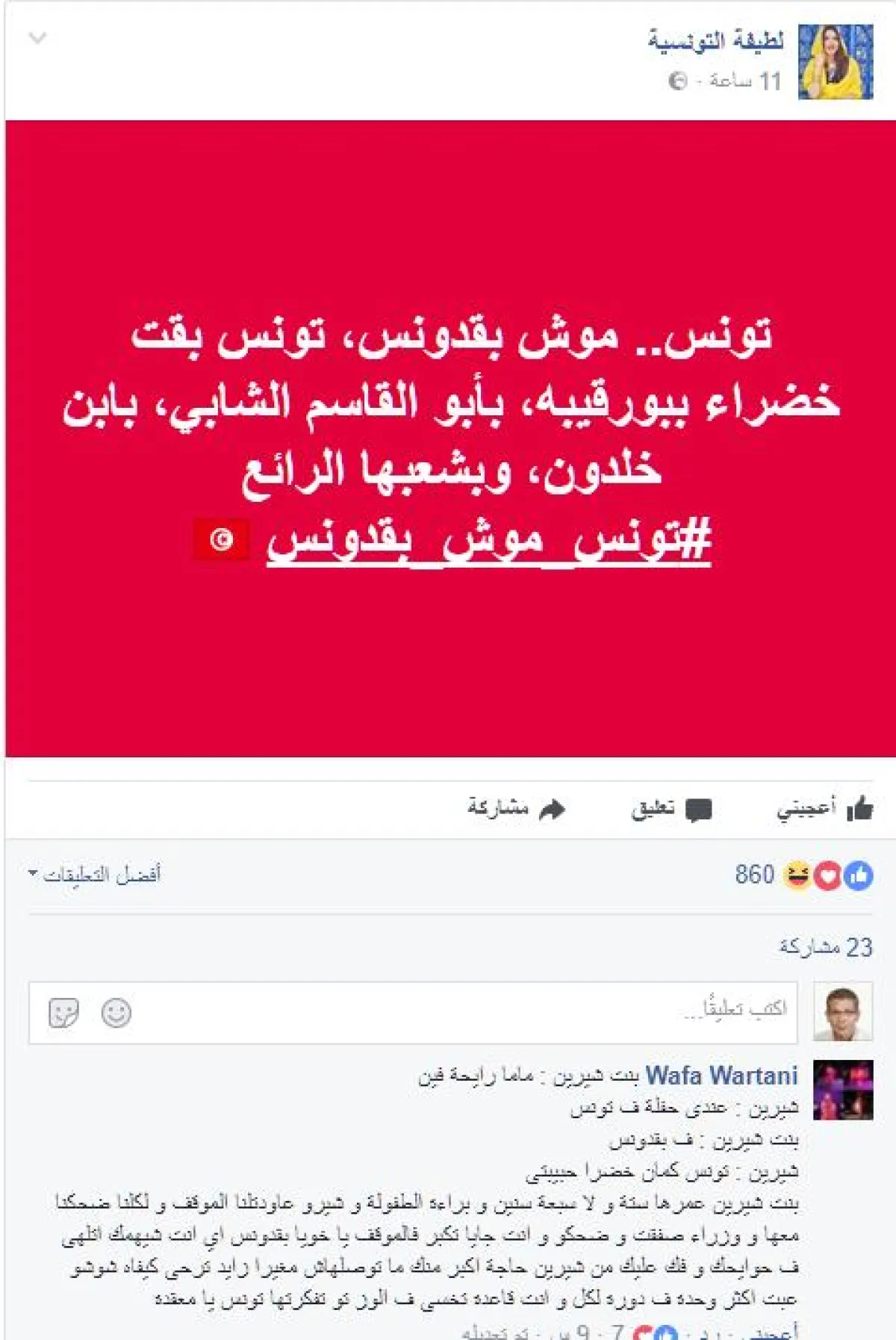 ردّت الفنّانة التونسية لطيفة على التصريحات المسيئة لزميلتها المطربة شيرين عبد الوهاب بحقّ بلادها تونس وقولها أن ابنتها "لا تعرف الفرق بين تونس والبقدونس"، وأطلقت هاشتاق مساء أمس السبت بعنوان "تونس مش بقدونس"، واللافت أنّ متابعات للطيفة من تونس حضرن الحفل أكّدن أنّ شيرين لم تخطىء وأنّ القصّة تم نقلها بالخطأ من أجل الإساءة للفنانة المصرية والوقيعة بين نجوم البلدين!!