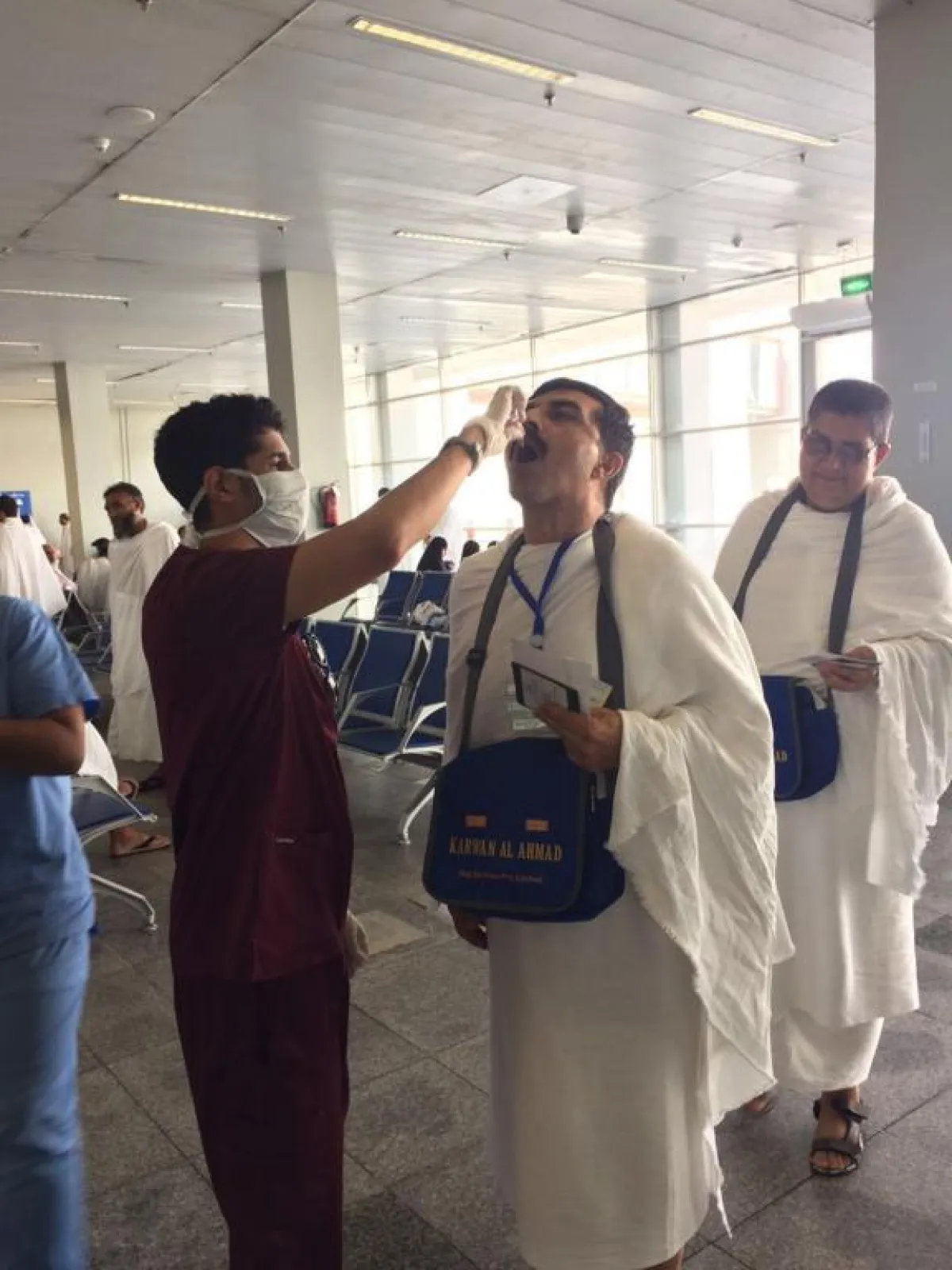 وسط استعدادات مكثفة وحثيثة لوزارة الصحة لموسم حج هذا العام، وانطلاقاً من دورها الرئيسي في تقديم الرعاية الصحية لضيوف الرحمن منذ لحظة وصولهم للمملكة، استقبلت فرق الطب الوقائي بمركز المراقبة الصحية بمطار الملك عبدالعزيز الدولي بجدة صباح أمس الأول أولى طلائع الحجاج والقادمة من باكستان، لتطبيق الاشتراطات الصحية كأول الإجراءات في الصالة، وأوضح مدير الشؤون الصحية بمحافظة جدة الدكتور مشعل السيالي بأن صحة جدة تكثف حالياً جهودها، وأكملت كافة التجهيزات لاستقبال وخدمة حجاج بيت الله الحرام منذ وقت مبكر، مؤكداً حرص وزارة الصحة على تطوير العمل بالمنفذ وتعزيز مستوى التكامل بين كافة المرافق الصحية، وذلك بهدف الارتقاء بمستوى الخدمات الطبية المقدمة لضيوف الرحمن.