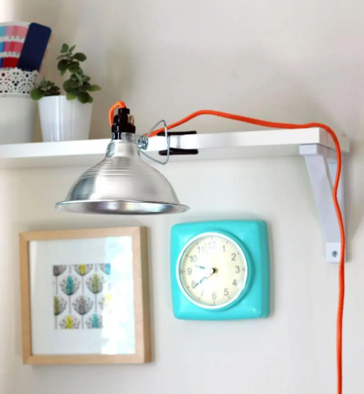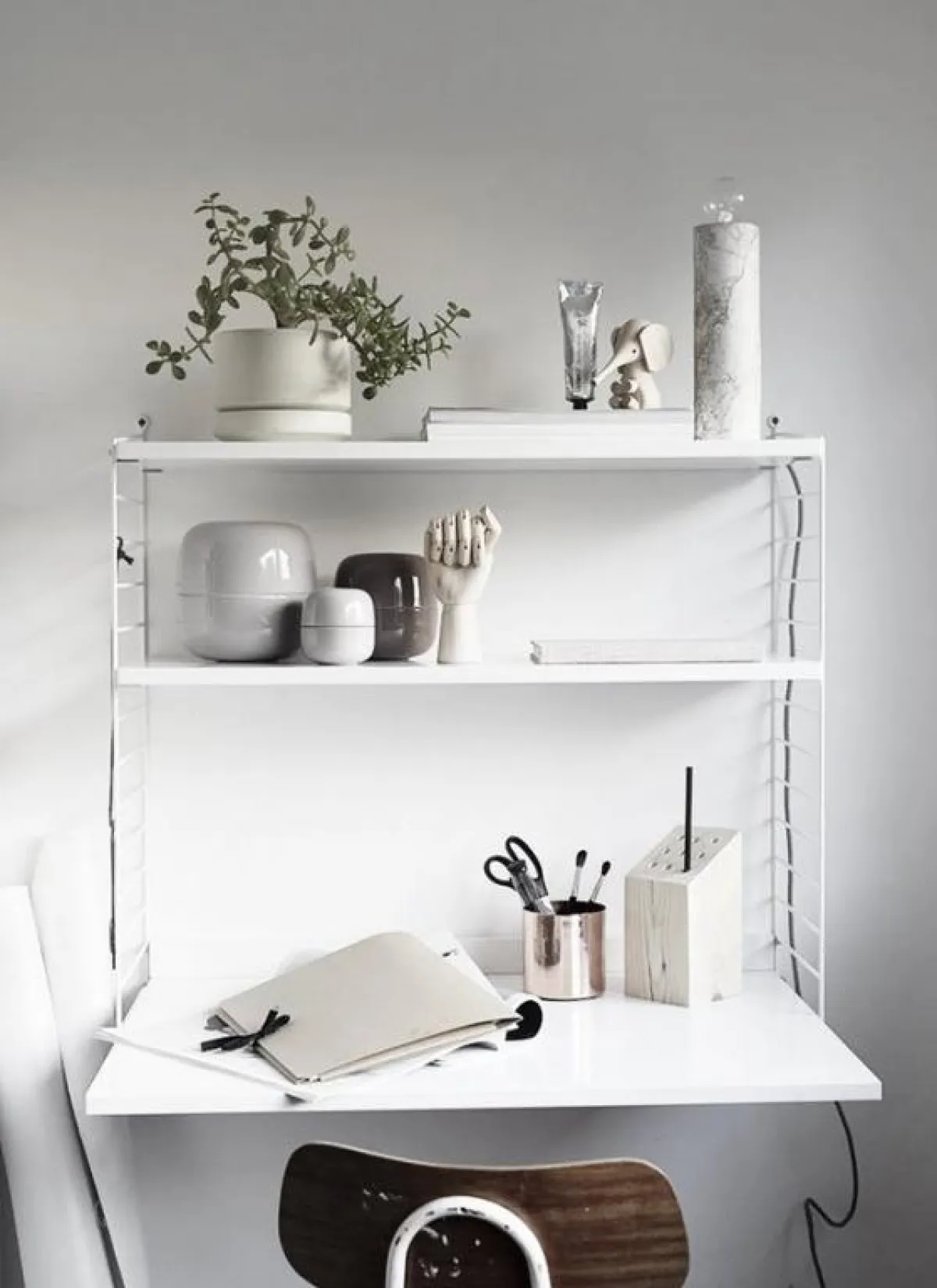 يُثبت رفّ على أحد الجدران في غرفة المعيشة أو غرفة النوم، ويمكن أن يُزوّد بدرج سحّاب يحمل على سطحه الـ"لابتوب" وإضاءة جانبية مخصّصة للقراءة، لغرض العمل في المنزل. وإذا كان الجدار فارغًا بالكامل، يمكن تثبيت ثلاثة رفوف فوق بعضها البعض، على أن يكون الأوّل بعمق أكبر مخصّص للعمل، والاثنان الآخران لحمل الكتب والأدوات اللازمة.