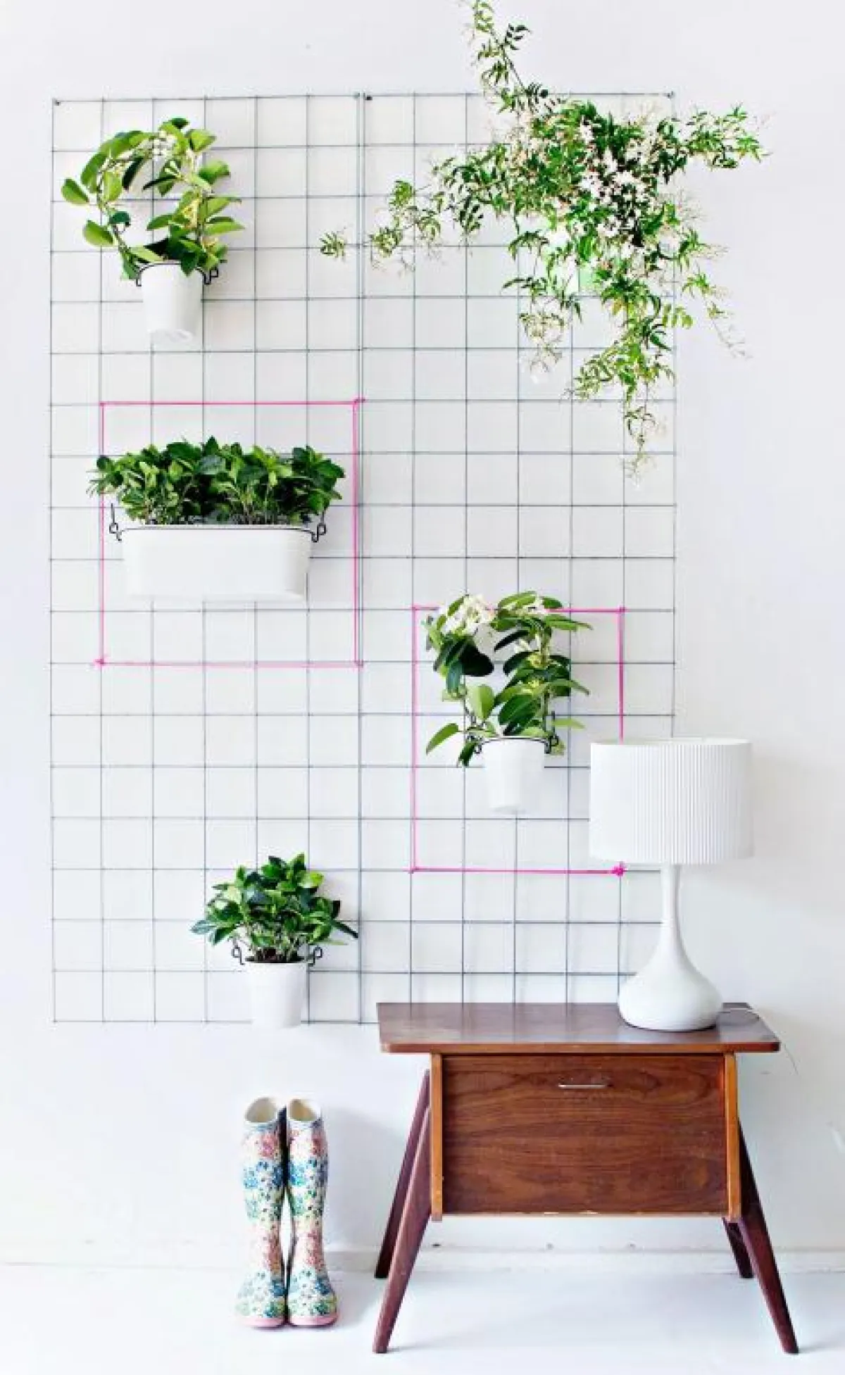 عندما لا تتوفّر شرفة ملحقة بالشقّة، تُعلّق أوعية صغيرة حاوية النباتات الخضر على جدار فارغ ، بصورة عشوائيّة أو مُنظّمة، ما ينعش الغرفة.