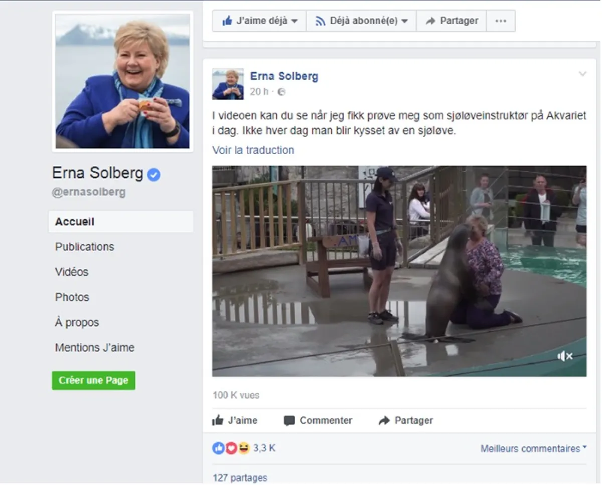 وقامت إيرنا سولبيرغ، المعروفة بمبادراتها الكثيرة من أجل البيئة، بتحية «أسد البحر» في إحدى الحدائق الواقعة بالنرويج التي تُعنى بتربية هذا الحيوان النادر، ونشرت في تدوينة على صفحتها بموقع التواصل الاجتماعي «فيس بوك»، فيديو يظهرها وهي تقبل هذا الحيوان وتحييه في بادرة حسن نية معه.