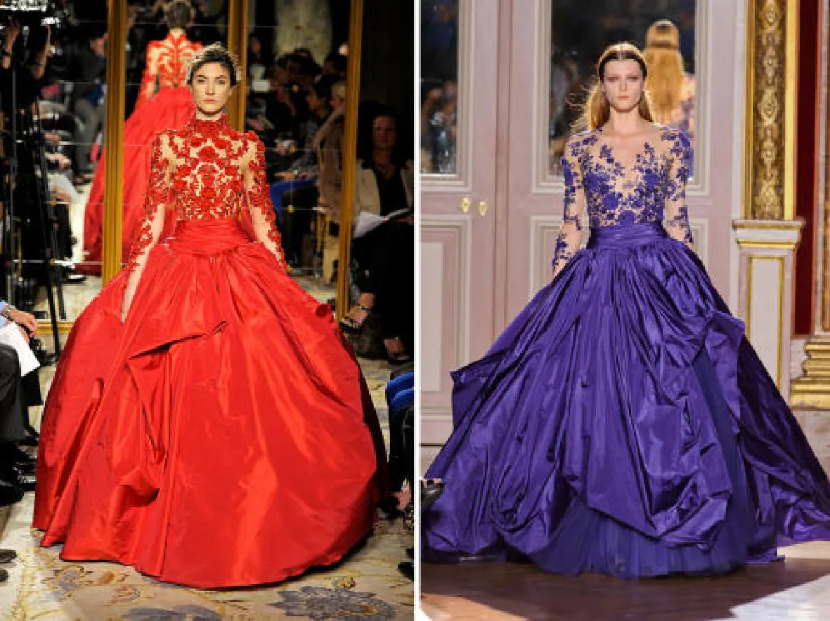 1- رأينا في مجموعة الملابس الجاهزة لخريف وشتاء 2012 من "ماركيزا" Marchesa فستاناً ملكياً باللون الأحمر وبعد عرض المجموعة بأشهر ظهر تصميم مشابه له إلى حدٍ كبير في مجموعة الأزياء الراقية لخريف وشتاء 2012 من "زهير مراد".