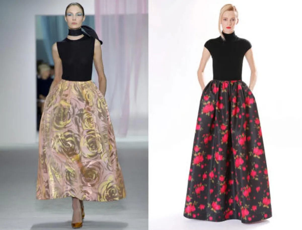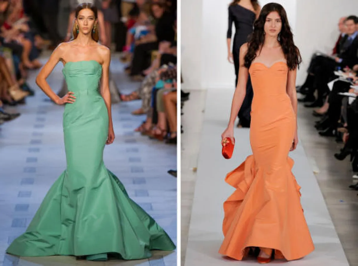 2- في أسبوع الموضة لموسم ربيع وصيف 2013 رأينا فستان سهرة جميل بلون الزمرّد تميّزه قصّة سمكة في عرض المصمم"زاك بوزن" Zac Posin, ثم رأينا تصميماً مشابهاً له في مجموعة "أوسكار ديلا رينتا" Oscar de la Renta. لما قبل خريف 2013 التي عرضت الأسبوع الماضي .