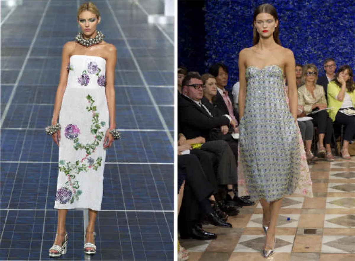 4- قد لا تكون فكرة الفساتين القصيرة المزيّنة بالورود جديدة على عالم الموضة ولكن من برأيكِ نفذها بشكل أجمل "ديور" Dior في مجموعة الأزياء الراقية لخريف 2012 أو "شانيل" Chanel في مجموعة ربيع وصيف 2013؟