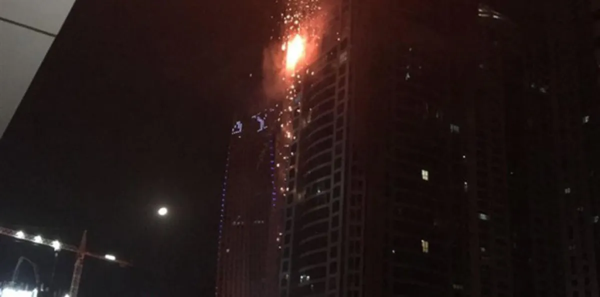 وجاء في تغريدة على تويتر على حساب المكتب الإعلامي لحكومة دبي: "الدفاع المدني يتعامل مع حريق شب في برج بمنطقة المارينا في دبي".