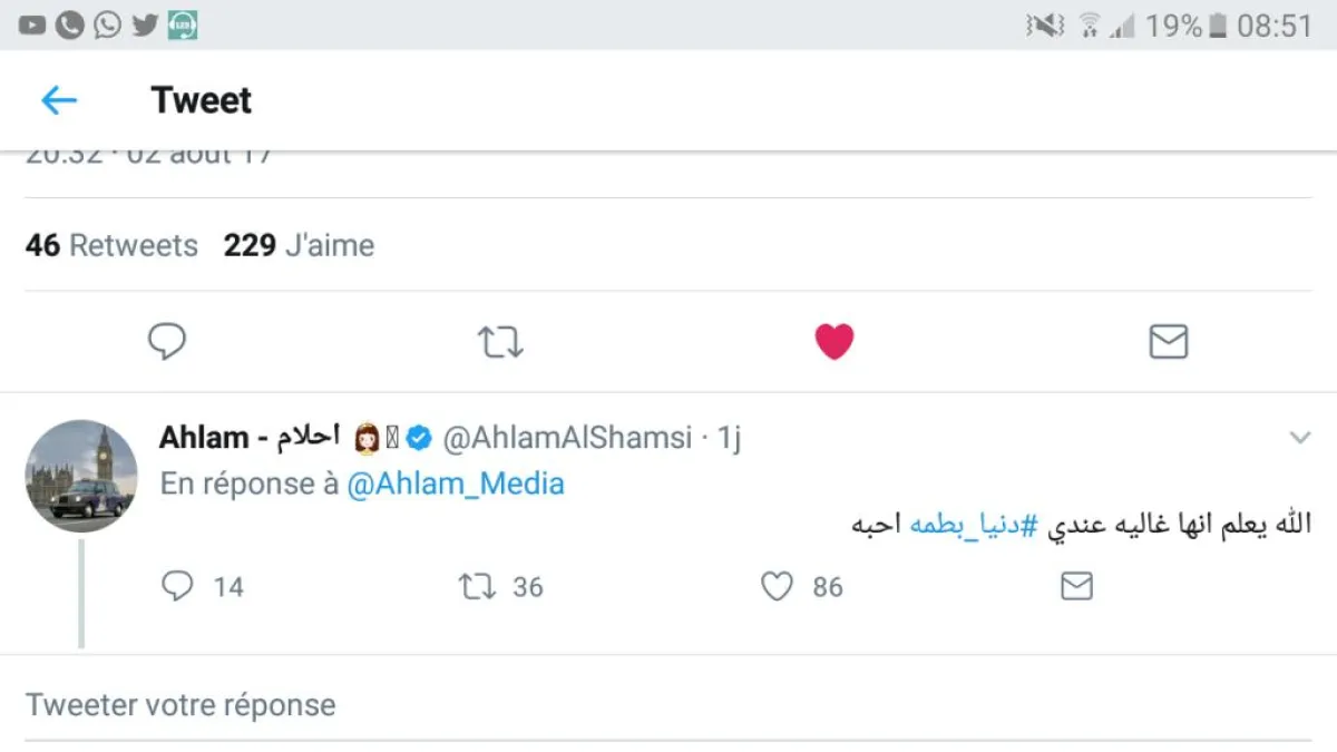 الفنانة أحلام بدورها ردت عليها بتغريدة عبر حسابها الشخصي على " تويتر " قالت فيها: "الله يعلم أنها غالية عندي دنيا بطمه أحبه ".