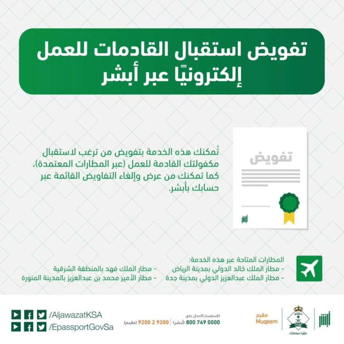 وأضافت أن "هذه الخدمة تمكّنك من تفويض من ترغب لاستقبال مكفولتك القادمة للعمل عبر المطارات المعتمدة"، مشيرة إلى أنه يمكن لمستخدمها كذلك عرض وإلغاء التفويض عبر حسابه في "أبشر".