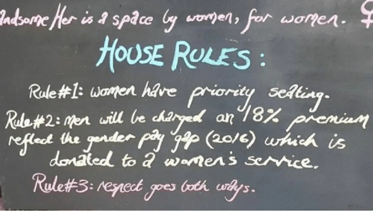 ووفقاً للصحيفة فإن مقهى "The Handsom Her" يفرض رسوماً أكبر بنسبة 18% على الرجال كما يمنح زائراته أولوية اختيار المقاعد، وذلك في إطار جهوده لتقليص فجوة الأجور بين الجنسين.