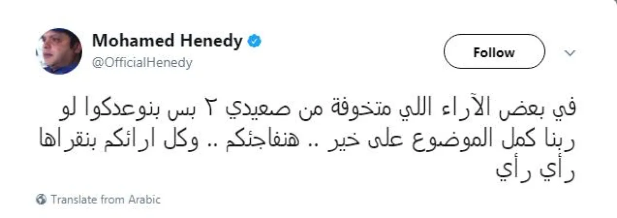 وكتب هنيدي عبر حسابه بموقع التدوينات القصيرة «تويتر»: «في بعض الآراء اللي متخوفة من صعيدي 2 بس بنوعدكوا لو ربنا كمل الموضوع على خير، هنفاجئكم، وكل آرائكم بنقراها رأي رأي».