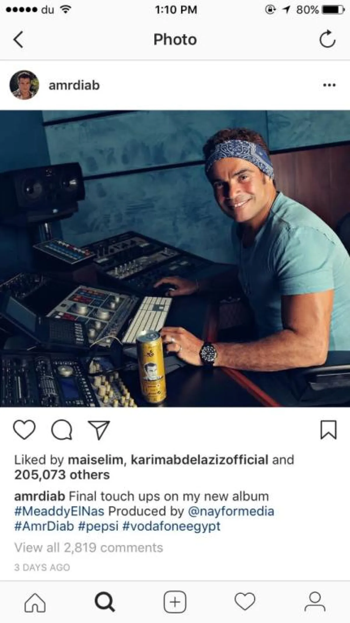 نشر الفنان عمرو دياب صورة له أثناء تواجده في الأستوديو لوضع اللمسات الأخيرة لألبوم «معدي الناس»، واللافت للنظر في الصورة الساعة التي يرتديها عمرو دياب، فقد أحدثت ضجة كبيرة عبر السوشل ميديا وهي من ماركة rolex، وصنع منها فقط 50 قطعة في العالم ويبلغ ثمنها 18 ألف دولار أميركي.
