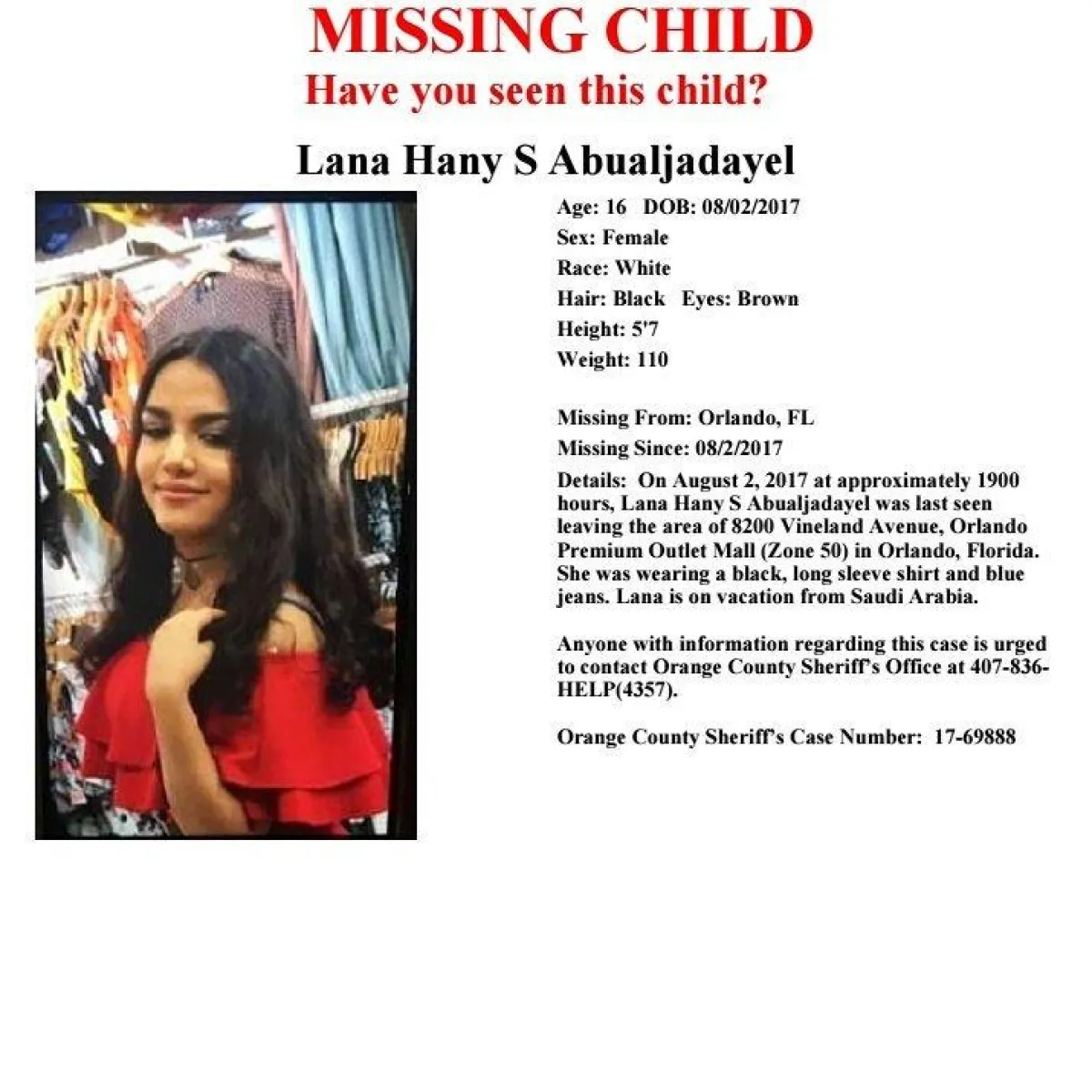 جدير بالذكر، أن القضية ظهرت للعلن بعد أن نشرت الشرطة في مقاطعة أورانج في ولاية فلوريدا الأمريكية صورة للفتاة لانا أبو الجدايل إثر اختفائها، وكشف المتحدث باسم شرطة المقاطعة، أن الفتاة كانت تمضي عطلة مع عائلتها في مدينة أورلاندو في ولاية فلوريدا قبل أن تختفي عن الأنظار يوم الأربعاء الماضي، ليتم العثور عليها يوم الأحد. وأشار إلى أنها عادت سالمة دون ذكر أي تفاصيل حول الاختفاء وكيفية العودة.
