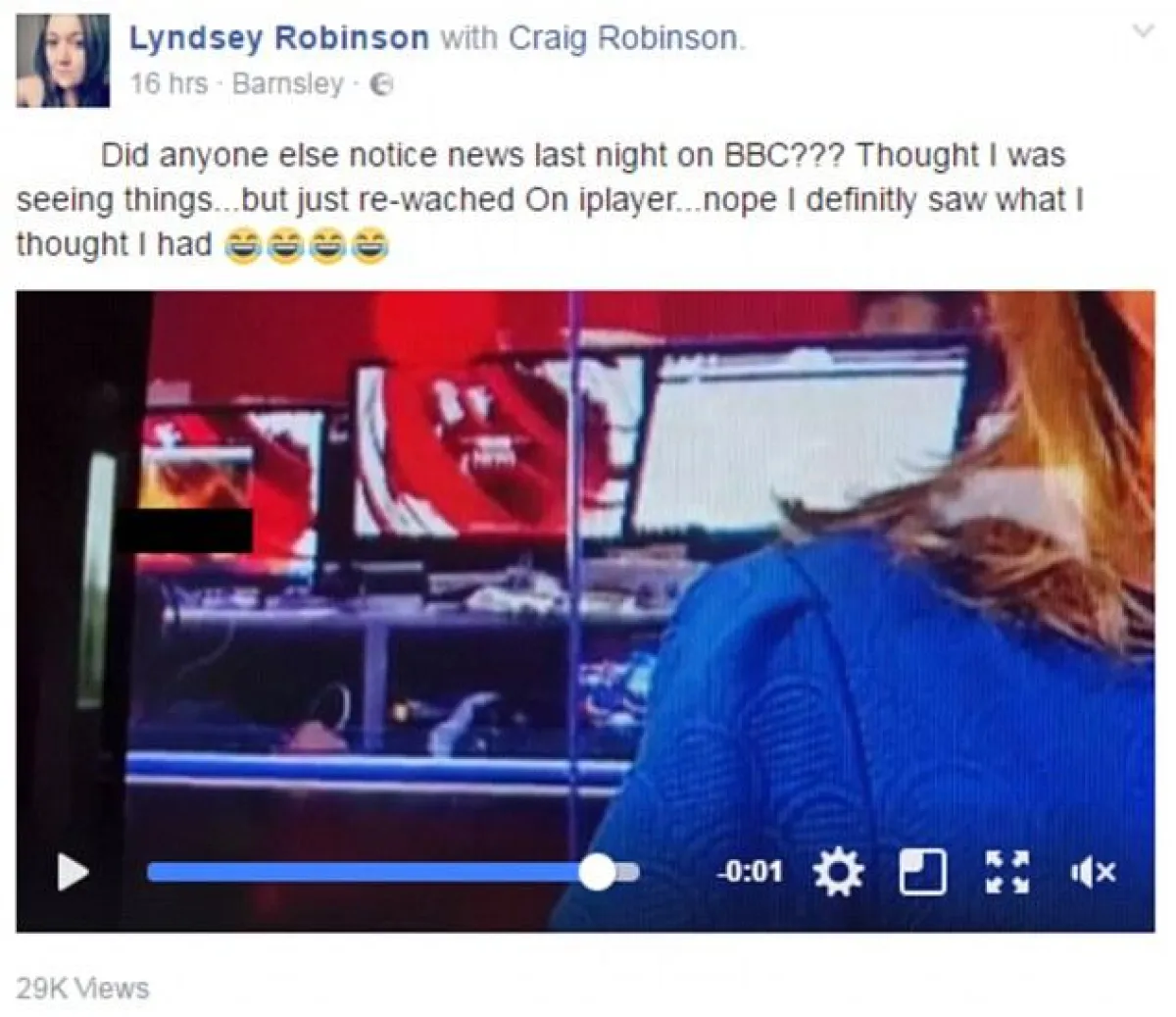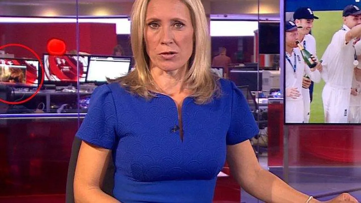 وكانت المذيعة صوفي راورث، البالغة من العمر 49 عاماً، تقدّم فقرّة على الهواء مباشرة، عن انتصار فريق الكريكيت الإنكليزي على فريق جنوب إفريقيا، ولكن المشاهدين ذوي النظرة الثاقبة لاحظوا الشاشة الظاهرة خلف كتفها.