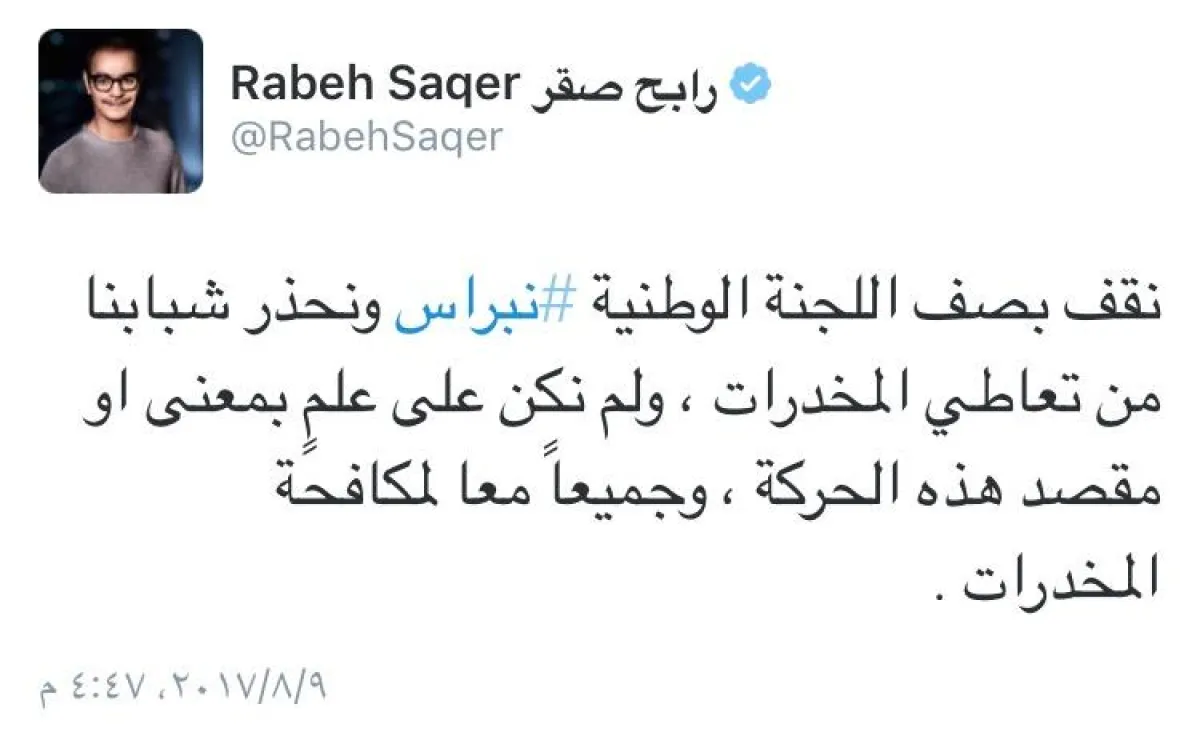 أكد الفنان رابح صقر عبر حسابه الرسمي بتويتر دعمه ووقوفه بجانب اللجنة الوطنية ( نبراس ) التي حذرت في وقت سابق عن القيام بحركة ( الداب ) والتي اشتهر بها الصقر خلال حفلاته وغرد قائلاً: "‏نقف بصف اللجنة الوطنية ‫#نبراس ونحذر شبابنا من تعاطي المخدرات ، ولم نكن على علمٍ بمعنى او مقصد هذه الحركة ، وجميعاً معا لمكافحة المخدرات ".