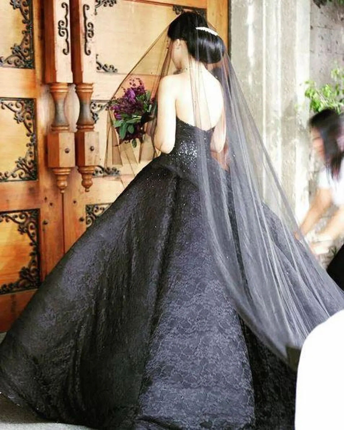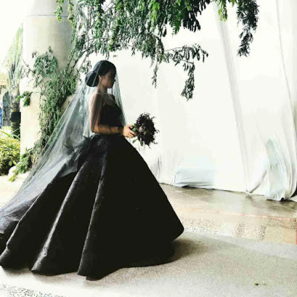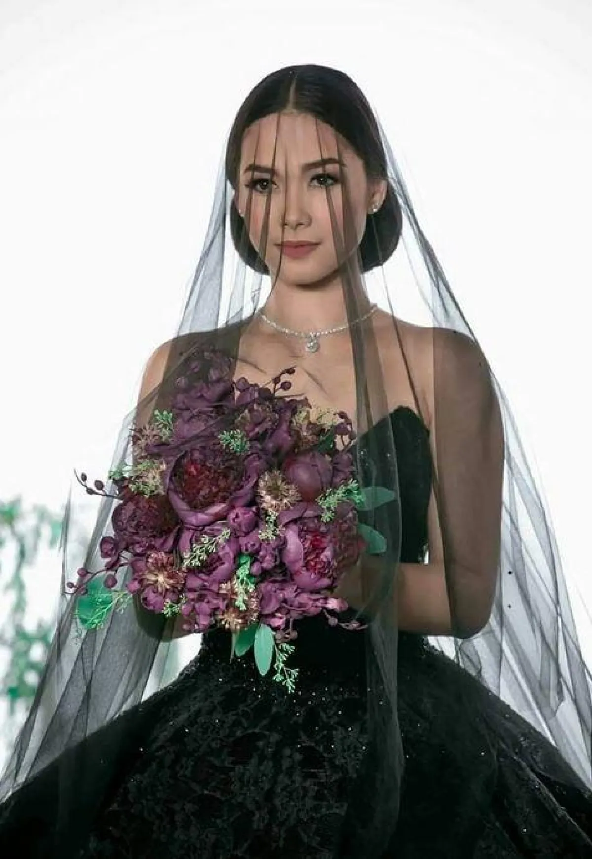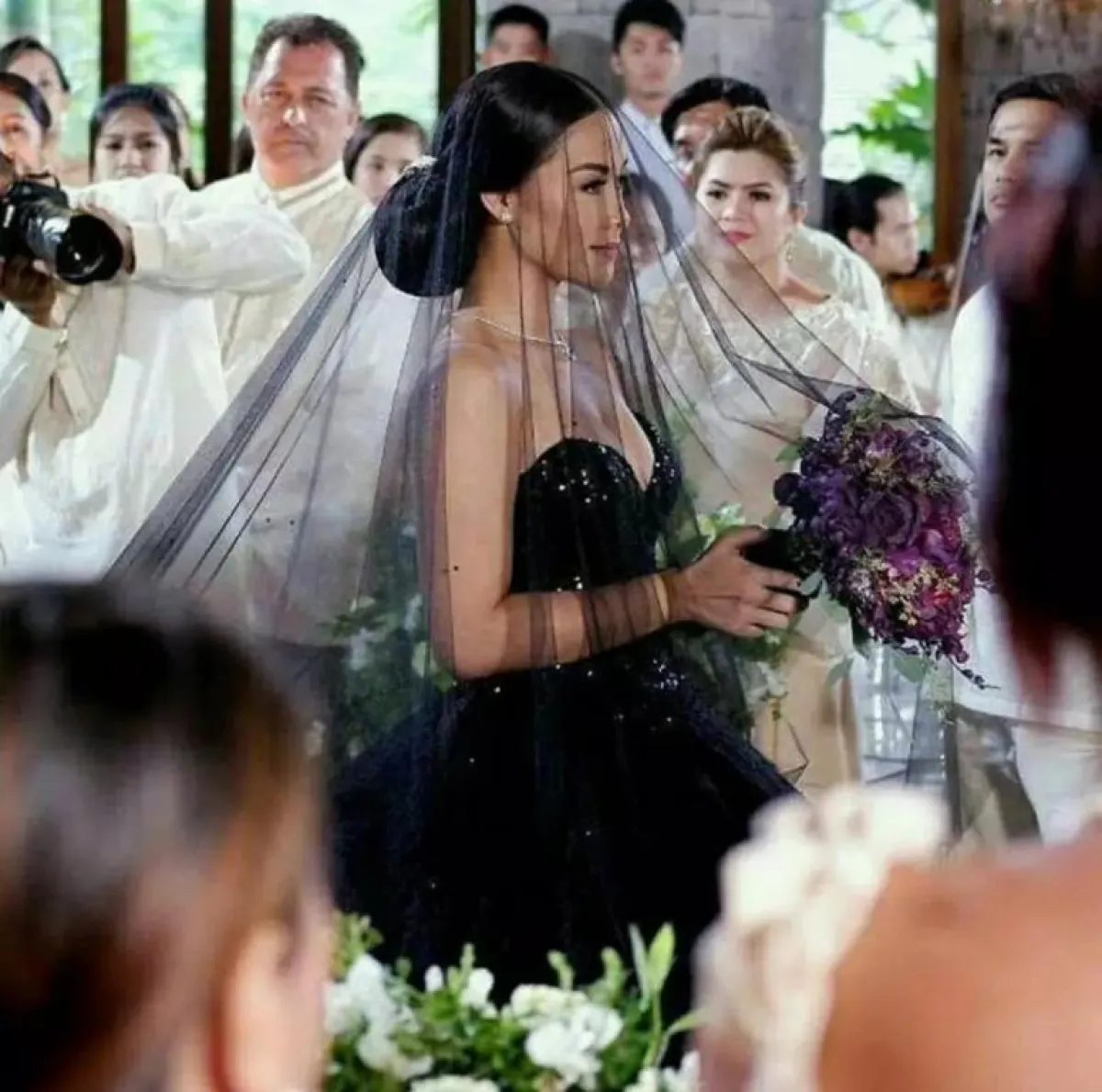 وتألقت العروس بفستان أسود ذي تصميم مميز وطرحة سوداء طويلة، واختارت تسريحة ناعمة، وأكملت إطلالتها بباقة من الورود البنفسجية.
