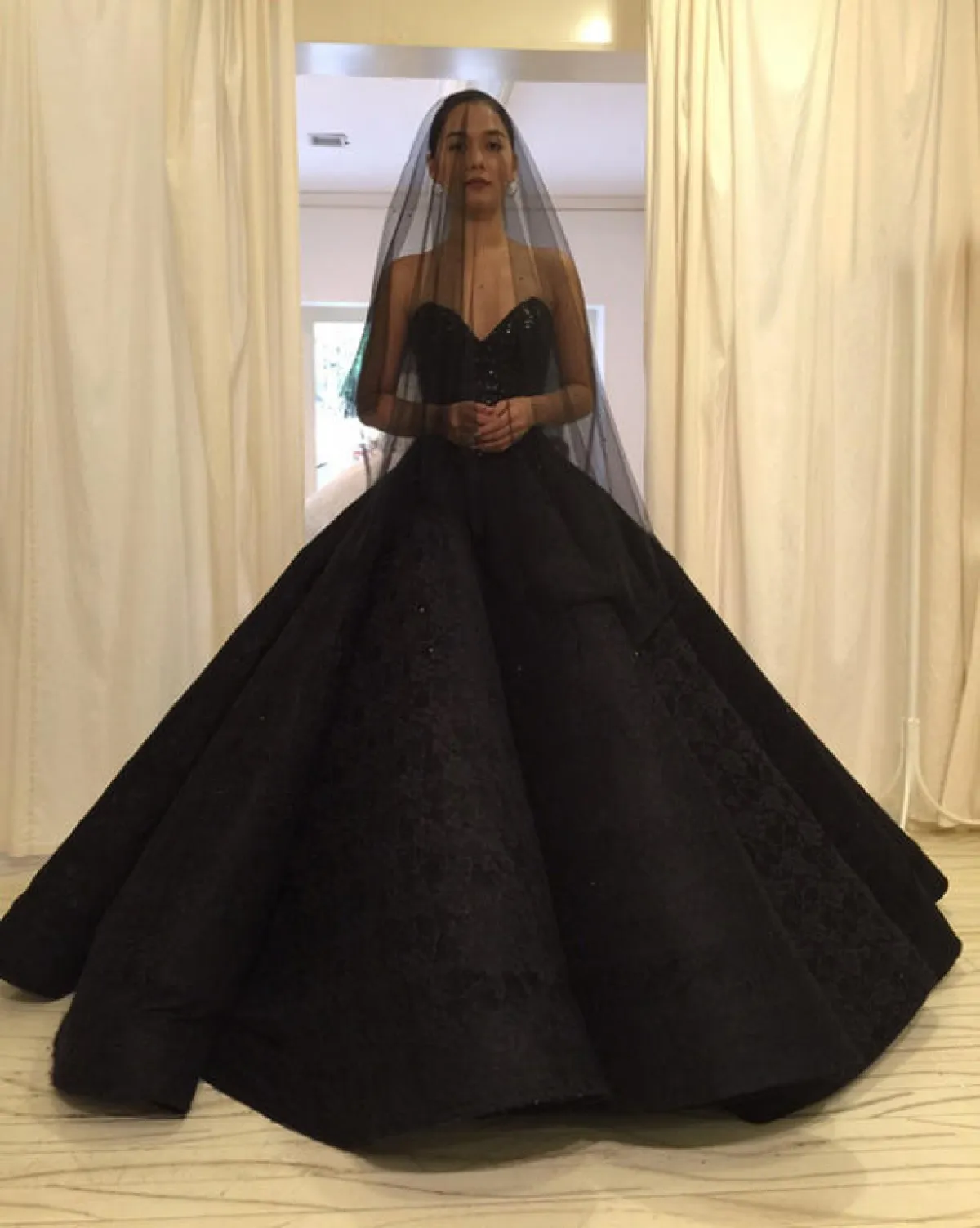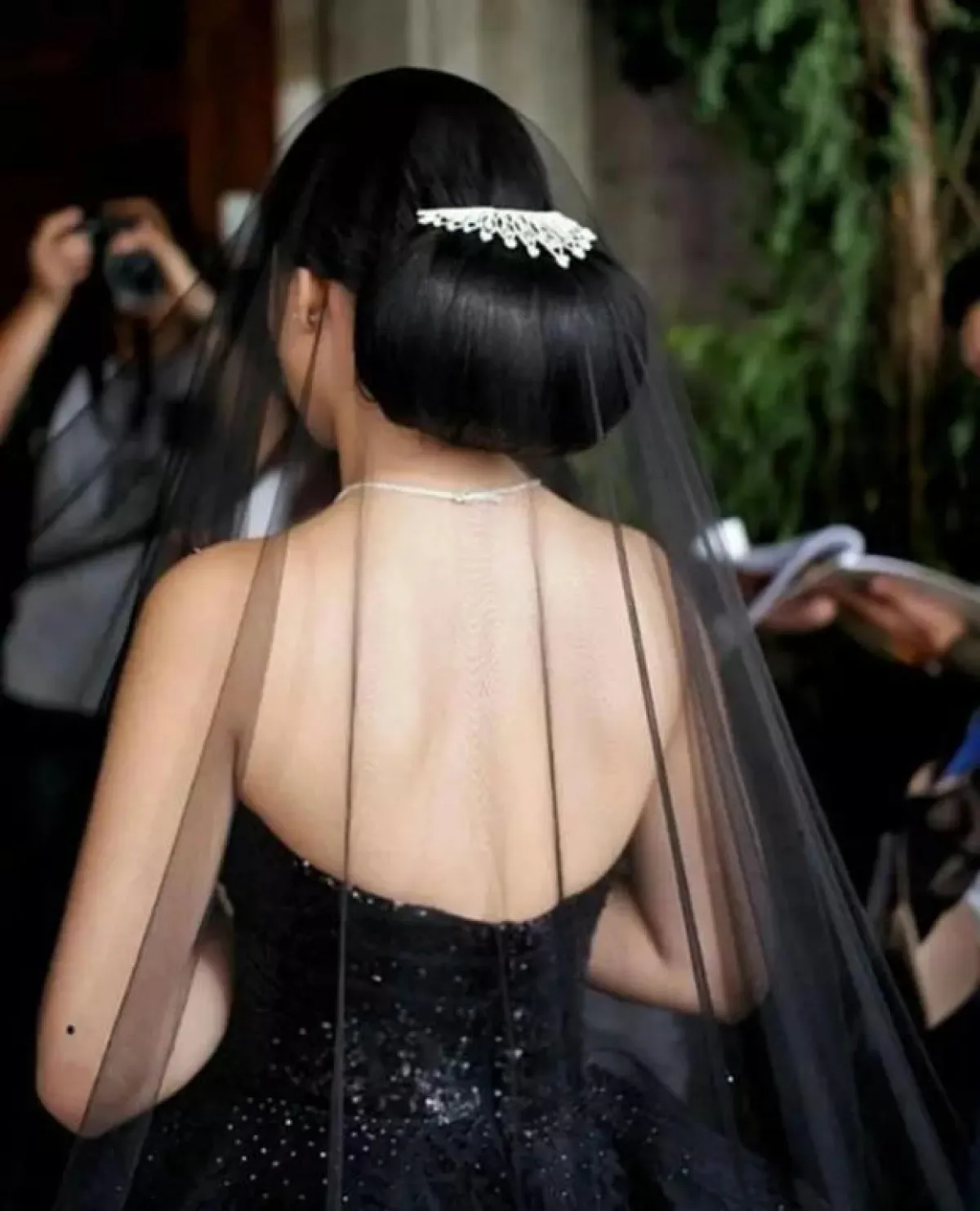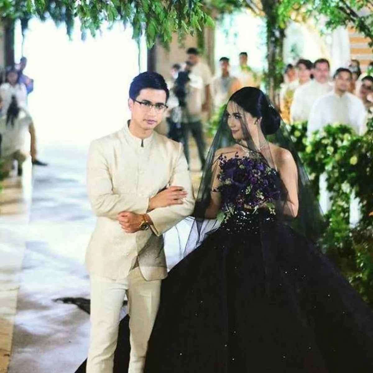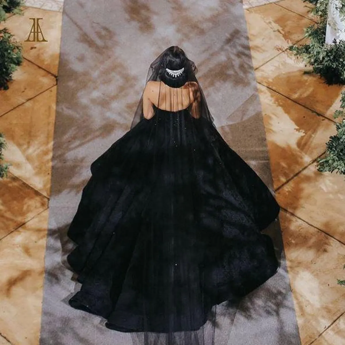 وتألقت العروس بفستان أسود ذي تصميم مميز وطرحة سوداء طويلة، واختارت تسريحة ناعمة، وأكملت إطلالتها بباقة من الورود البنفسجية.