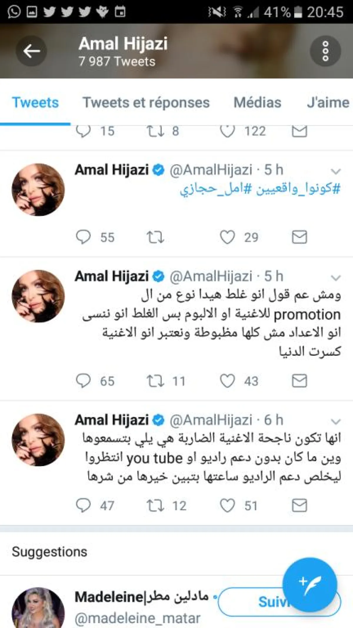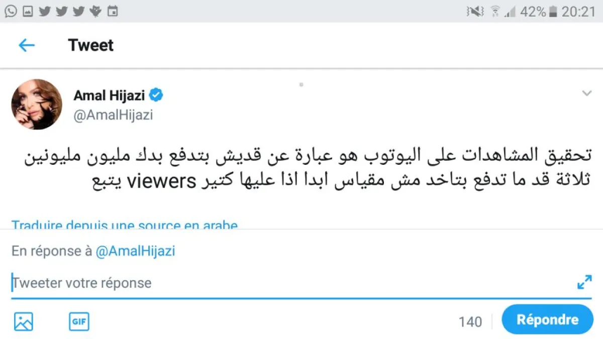 علقت الفنانة أمل حجازي على ارتفاع نسبة المشاهدات لأغنية سعد لمجرد بتدوينة على حسابها الخاص بتويتر أغضبت جمهوره جاء فيها : "تحقيق المشاهدات على اليوتيوب هو عبارة عن قديش بتدفع، بدك مليون، مليونين ثلاثة، قد ما تدفع بتاخد مش مقياس أبدا، إذ عليها كثير ".