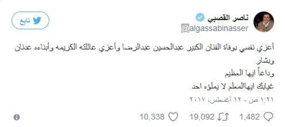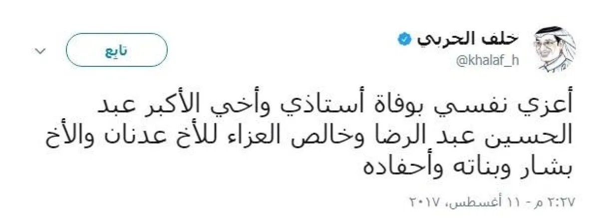بدوره الكاتب خلف الحربي غرّد: "أعزي نفسي بوفاة أستاذي وأخي الأكبر عبدالحسين عبدالرضا وخالص العزاء للأخ عدنان والأخ بشار وبناته وأحفاده".