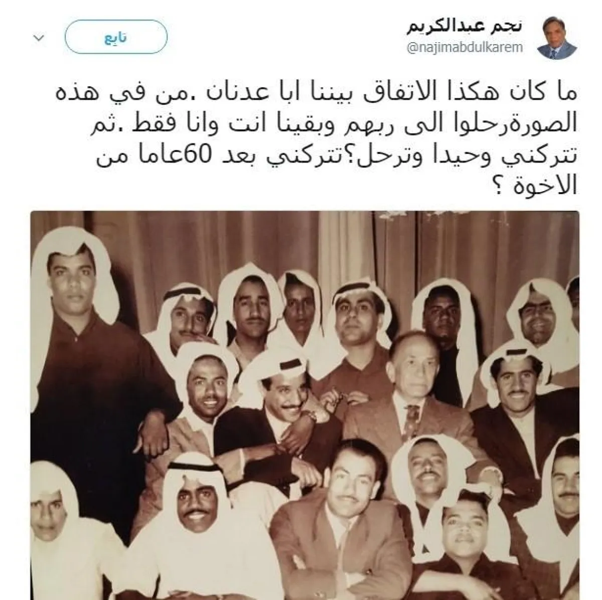 وغرد الإعلامي نجم عبدالكريم قائلاً: "ما كان هذا الاتفاق بيننا أبا عدنان.. من في هذه الصورة رحلوا إلى ربهم وبقينا أنت وأنا فقط.. ثم تتركني وحيداً وترحل؟ تتركني بعد 60 عاماً من الأخوة؟".