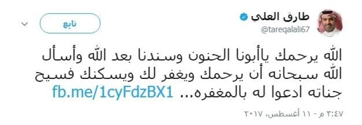 وغرد الفنان طارق العلي: "الله يرحمك يا من ترسم البسمة على شفاه جمهورك الكبير، والجلوس معك يبعث السعادة مهما بلغ حزن جليسك يا حبيبي يا بو عدنان".