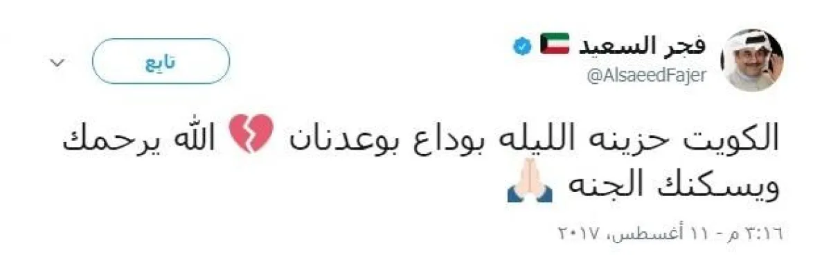 وعلقت الكاتبة الكويتية فجر السعيد عبر حسابها في تويتر: "عظم الله أجر الكويت كلها في #عبدالحسين_عبدالرضا .. #الكويت حزينة الليلة بوداع أبو عدنان.. الله يرحمك ويسكنك الجنة".