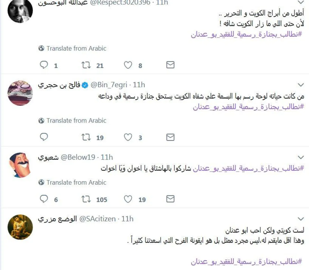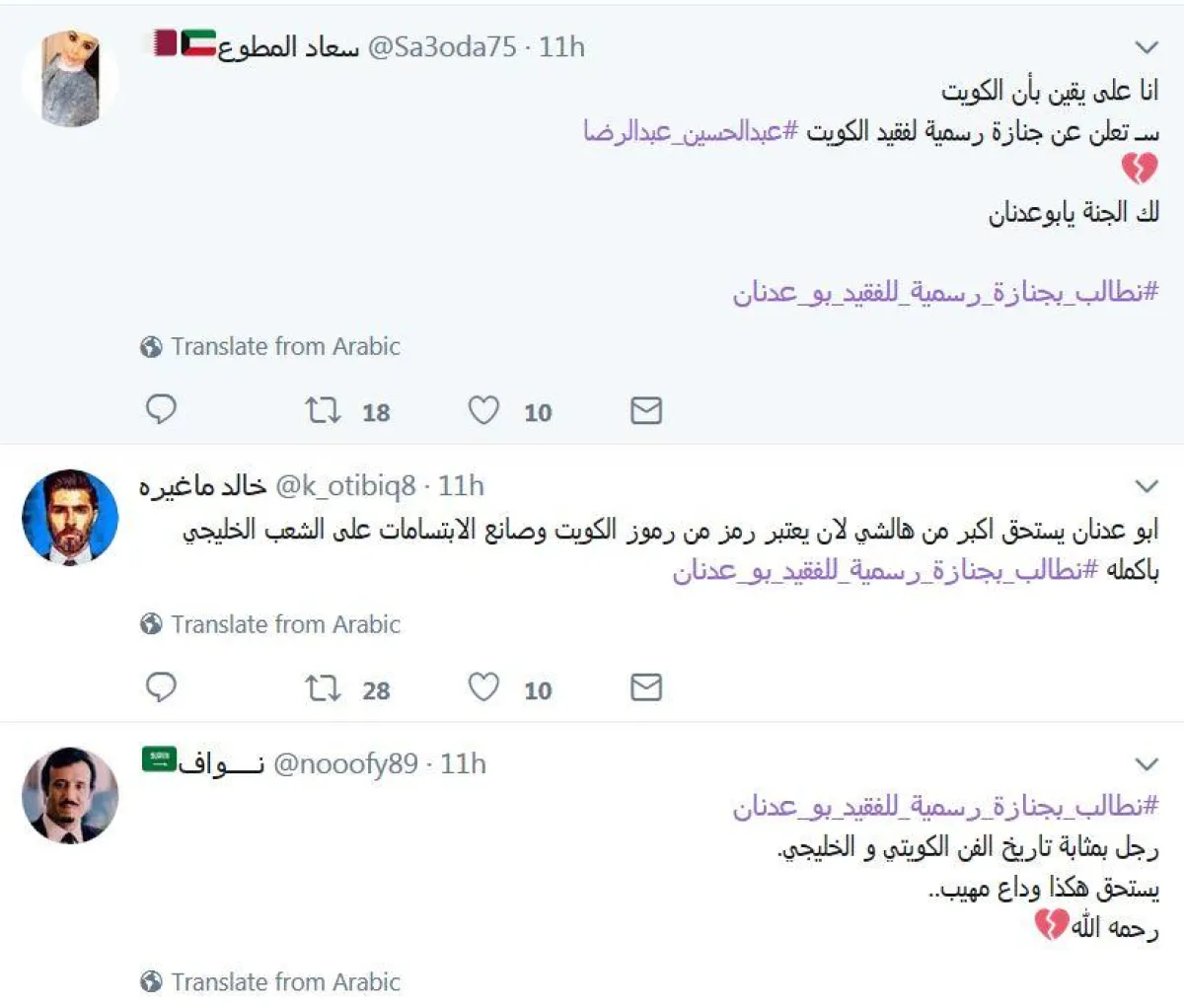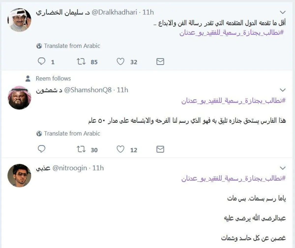 عقب رحيل الفنان الكويتي القدير عبد الحسين عبد الرضا، أطلق مغردون كويتيون وخليجيون هاشتاغ #نطالب_بجنازة_رسمية_للفقيد_بو_عدنان مؤكدين على أهمية الفن في بناء المجتمعات، وعلى دور الفقيد في إرساء قواعد الفن الهادف وإدخال البهجة والسرور على قلوب جمهوره على مدار 50 عاماً تقريباً.