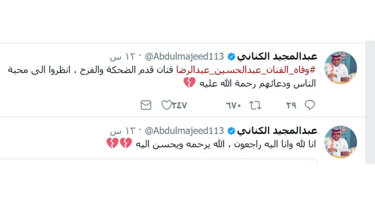 لينعى الوسط الفني والإعلامي السعودي، الراحل عبد الحسين بكلمات تظهر مدى خسارتهم له، عبر حساباتهم الشخصية على موقع تويتر