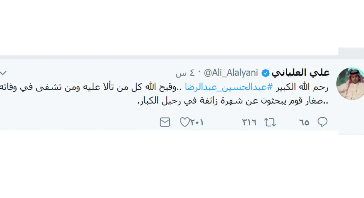 الممثل الشاب اللحيد قدم تعازيه ونعيه لأسرة الفقيد مغردًا " إنّا لله وإنّا إليه راجعون، الله يرحمه ويغفر له ويسكنه فسيح جناته، تعازينا لأسرة الفنان القدير. "